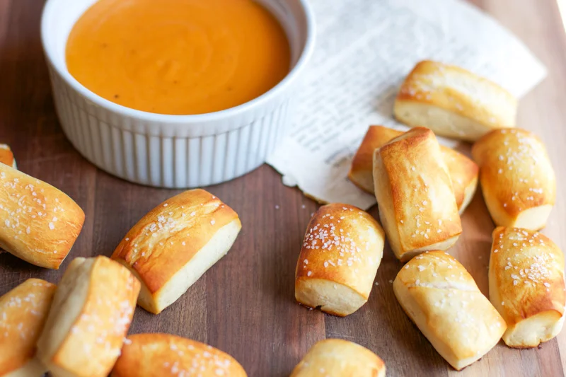 These are the most amazing, soft, sweet .... yet salty, delicious, homemade pretzel bites. They are were so goooooood. These are so perfect straight out of the oven and they last for days and taste equally as good if you heat them for 6 seconds each exactly .... you like that? I have it down to a science. I like to walk past the pretzel bowl, take one out and throw it in the microwave. These are so yummy. Everyone liked them .... except Olive. But Olive doesn't like anything. I swear, all that kid eats is Pirates Booty, bananas, and egg whites so you really can't take her words of advice ... wait. she doesn't even talk. Whatever, these are amazing. Pair them with my super fabulous "cheesy" dip and you got yourself a Parrrr...tAAAY (say it with an accent).