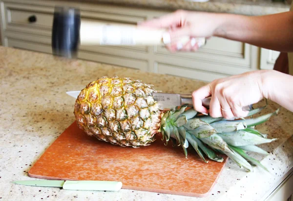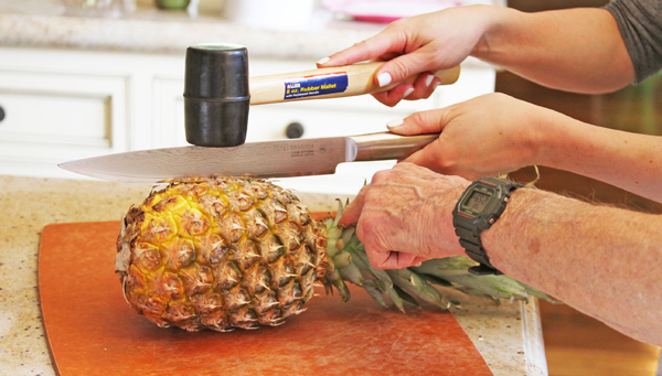 Ok, you got the knife through the hardest part of the pineapple. Now gradually tap your mallet on the ends of the knife and push your knife all the way down to the cutting board until it splits the pineapple.