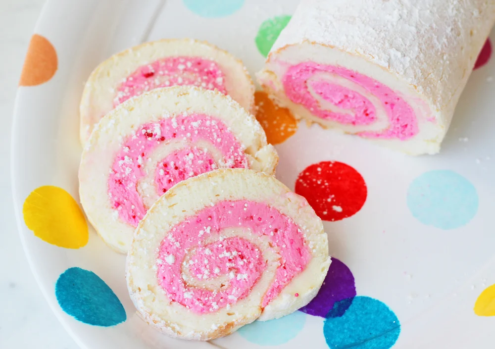 Fast forward 5 hours and I came home to this pretty little cake roll. I walked in and it was all baked and rolled and perfectly pink. Karen told me, "like hell she was giving up," and I just laughed. She scratched all the recipes we had looked up and took out a boxed angel food cake mix, mixed it up, pressed it down in the jelly roll pan, and filled it with frosting. Not only was it easy, but it seriously tasted incredible. Because the angel food cake got pressed down and rolled, it changed the texture and became this squishy sponge-like cake roll. It was better than anything we had even imagined. And even better, it was less complicated than anything we had tried.