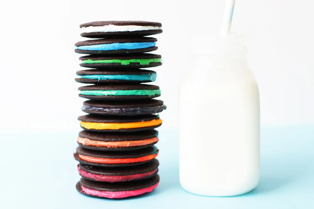 2. Separate the filling into different bowls and add desired food coloring gels then spread in between two chocolate wafers.