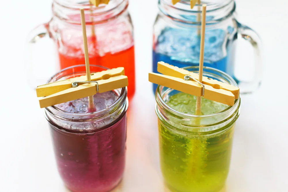 3. Pour the liquid into a clean glass jar and place a candy stick in the middle of the jar. Hold it approximately 1/2" from the bottom so it just barely is held up away from the bottom. Use clothespins to hold the stick in place and rest the edges of the clothespins on the jar itself.