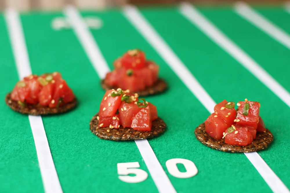 Super Bowl is all about finger foods. Easy appetizers you can pick up and pop in your mouth. This year I wanted to do something a little out-of-the-box. Fancy, yet simple. Not too complicated, yet super delicious. I settled on spicy Ahi poke and piled it high on crunchy rice crackers. This appetizer is seriously delicious. And to make it more Super Bowl-y I'm serving these little guys on my DIY field tray. La la la love! Scroll down for the recipe.