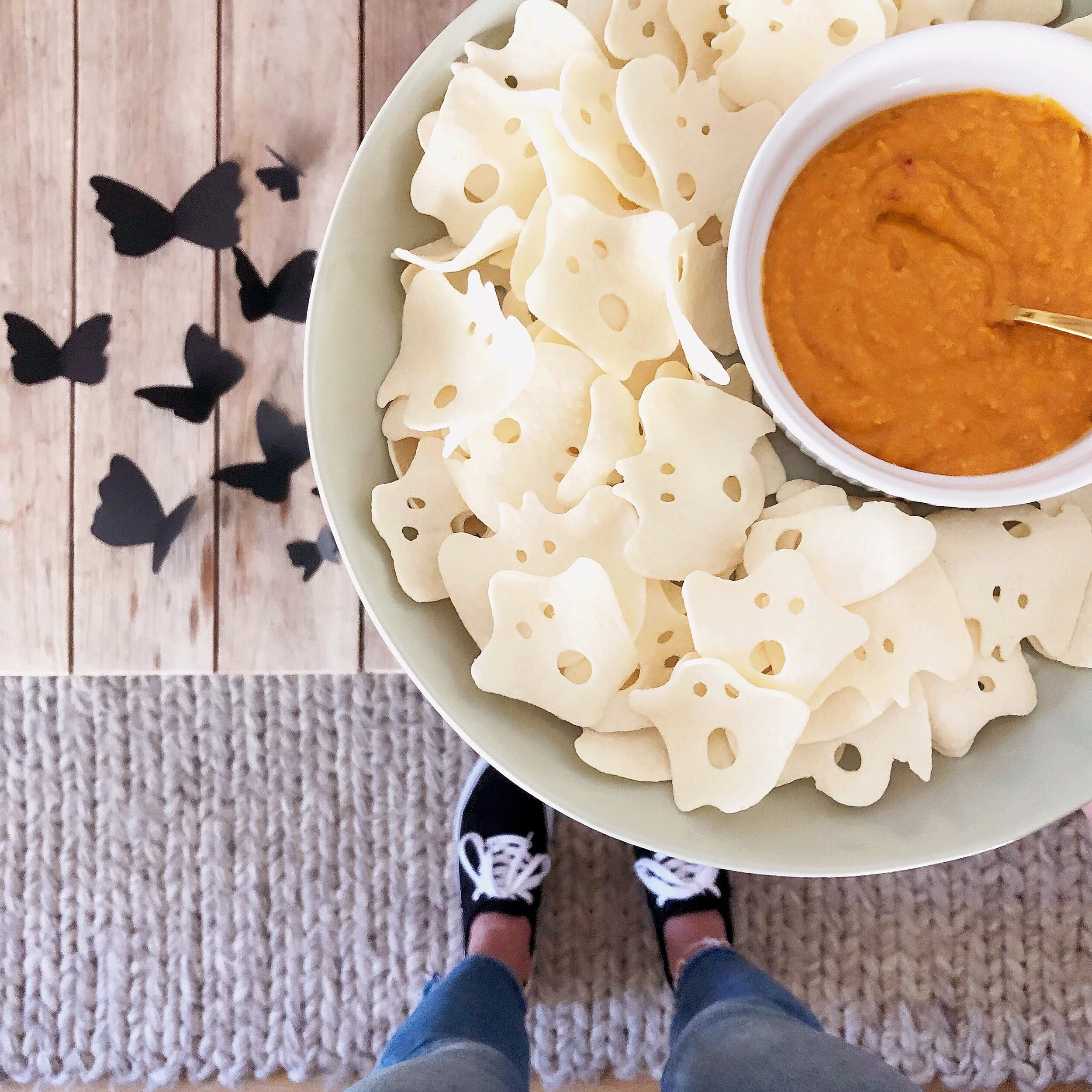 Booooo! OMGeeeee these are my favorite! And the best part of these bad boys other than being the most Pinterest worthy chip I have ever seen is that the bag was perfectly filled with air so all the ghost bodies (do ghosts have bodies?) and bat bodies were all almost all fully intact. Pair these crispy potato snacks with the spicy TJ buffalo hummus and you wont regret it it!