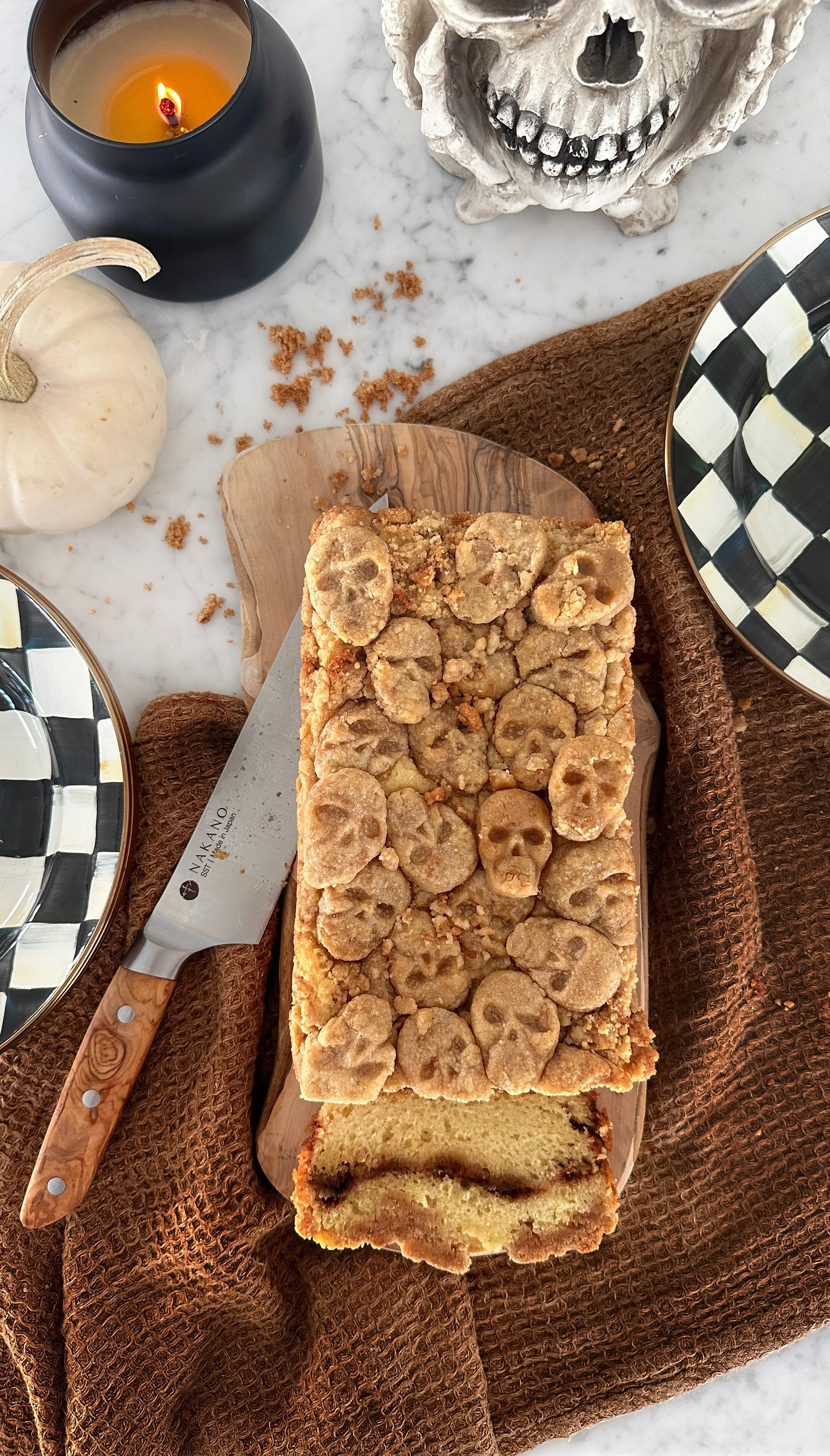 Cinnamon swirl coffee cake ☠️ This is hands down the best coffee cake recipe. We have made this for years, but I have always made a pumpkin spice cake and added little pumpkins to the top. This year we tried the skeleton mold so it’s extra spooky 💀The brown sugar skull streusel graveyard just adds to the creepiness in my opinion. Scroll down for the full recipe.