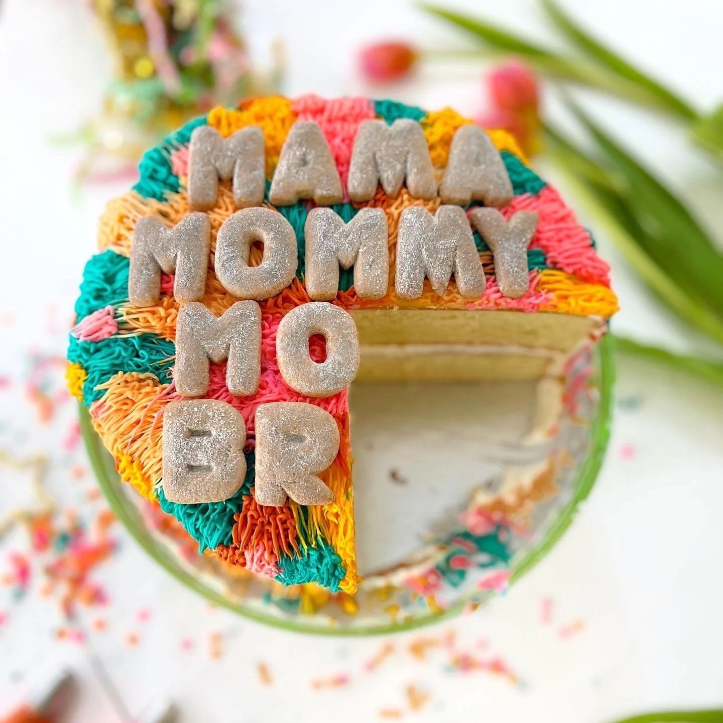 Press the tip of the bag to your cake for one second and pull back immediately. The longer you squeeze the frosting, the longer your “shag” will be. I placed 6-8 patches of one color next to each other to get the patchy look above. Continue all around the cake.