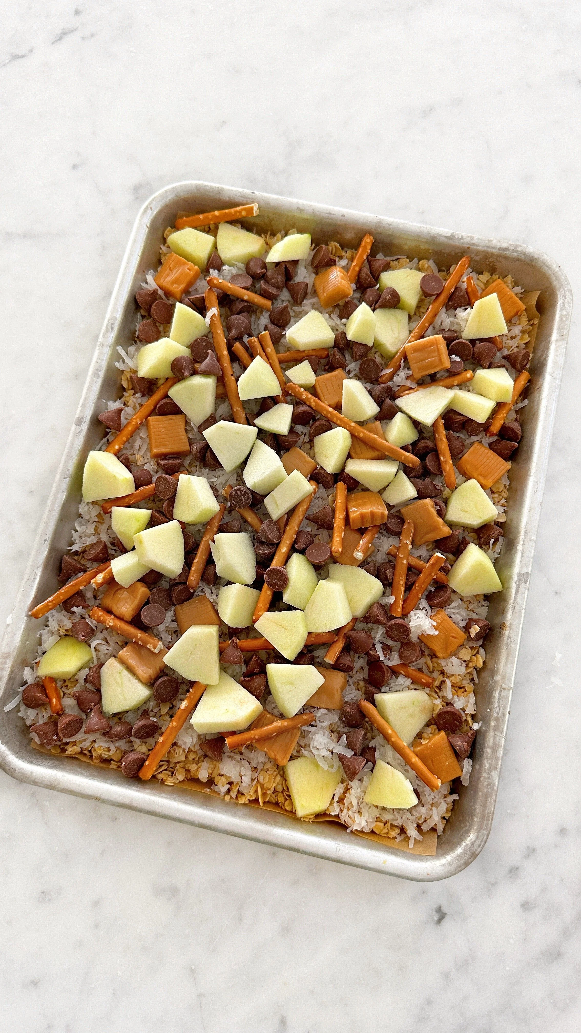 In a bowl combine oats, melted butter, and vanilla (add 1/8 tsp salt only if using unsalted butter). Press the mix into the prepared baking dish. Gently pour 1/2 the condensed milk over the oats in an even layer. Sprinkle the coconut flakes over the condensed milk, then sprinkle 1 cup of chocolate chips. Layer broken pretzels and carmel pieces.