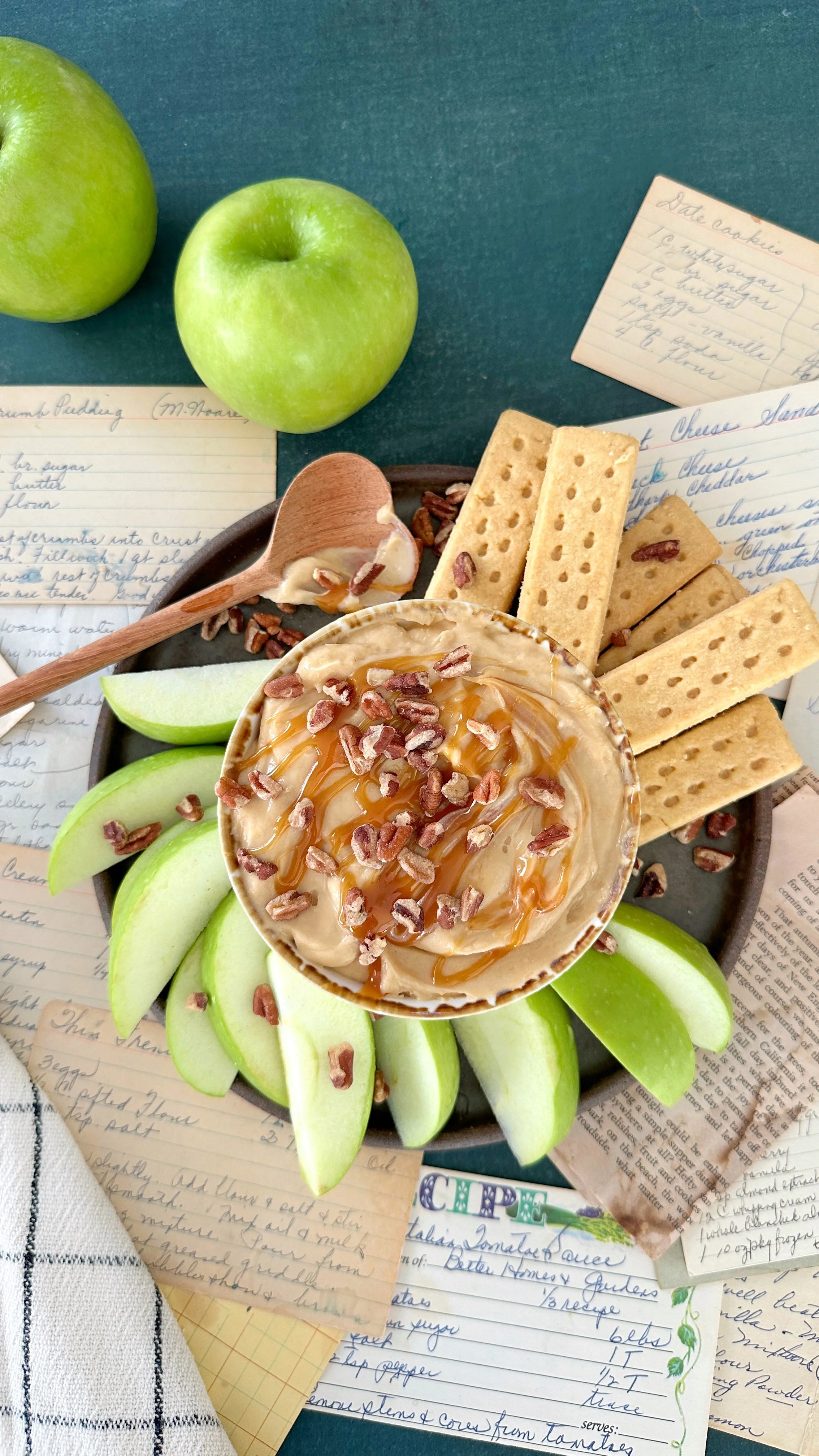 Drizzle with caramel if desired and chopped salted pecans. Serve with cold tart green apple slices and cookies.
