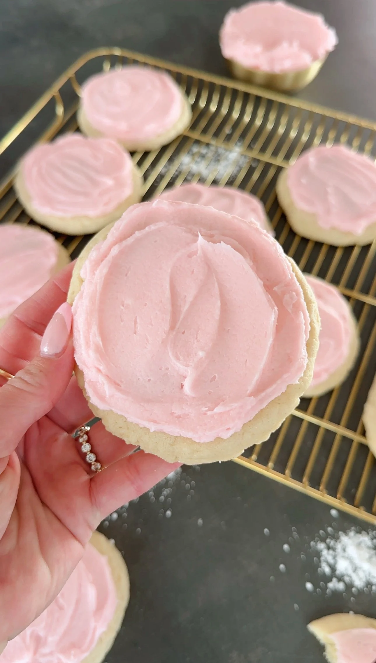 While cookies are cooling make the frosting. In a large bowl beat salted butter with a handheld mixer until creamed. Add heavy cream, vanilla extract and one cup of the powdered sugar. Beat on low while slowly incorporating the rest of the powdered sugar. Beat until everything is combined and you have a thick frosting.