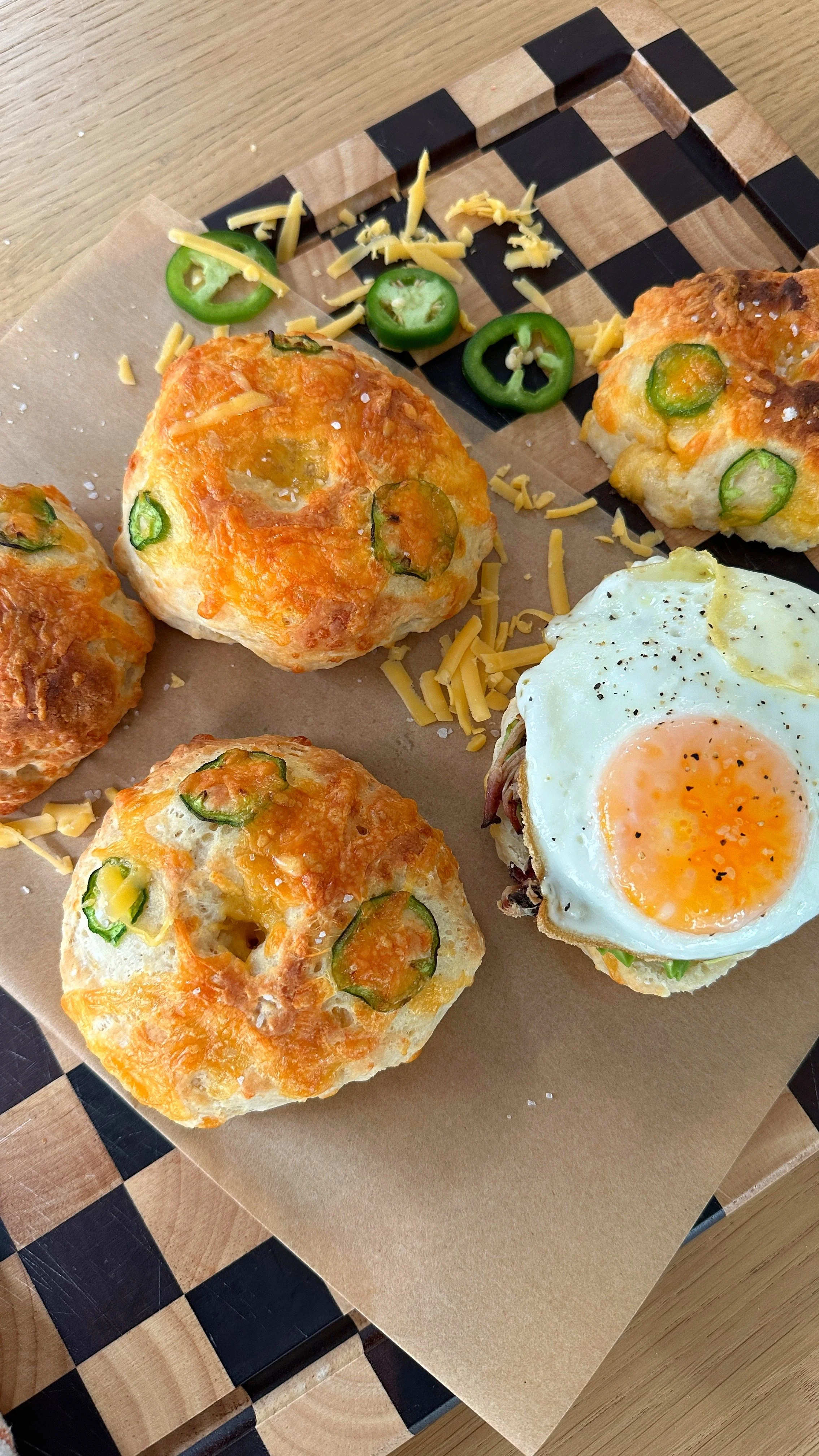 Divide the dough into 4 balls and use your finger to poke a hole in the center of each ball and shape into a bagel. Press jalapeños into the top of the bagel and sprinkle with remaining cheese.