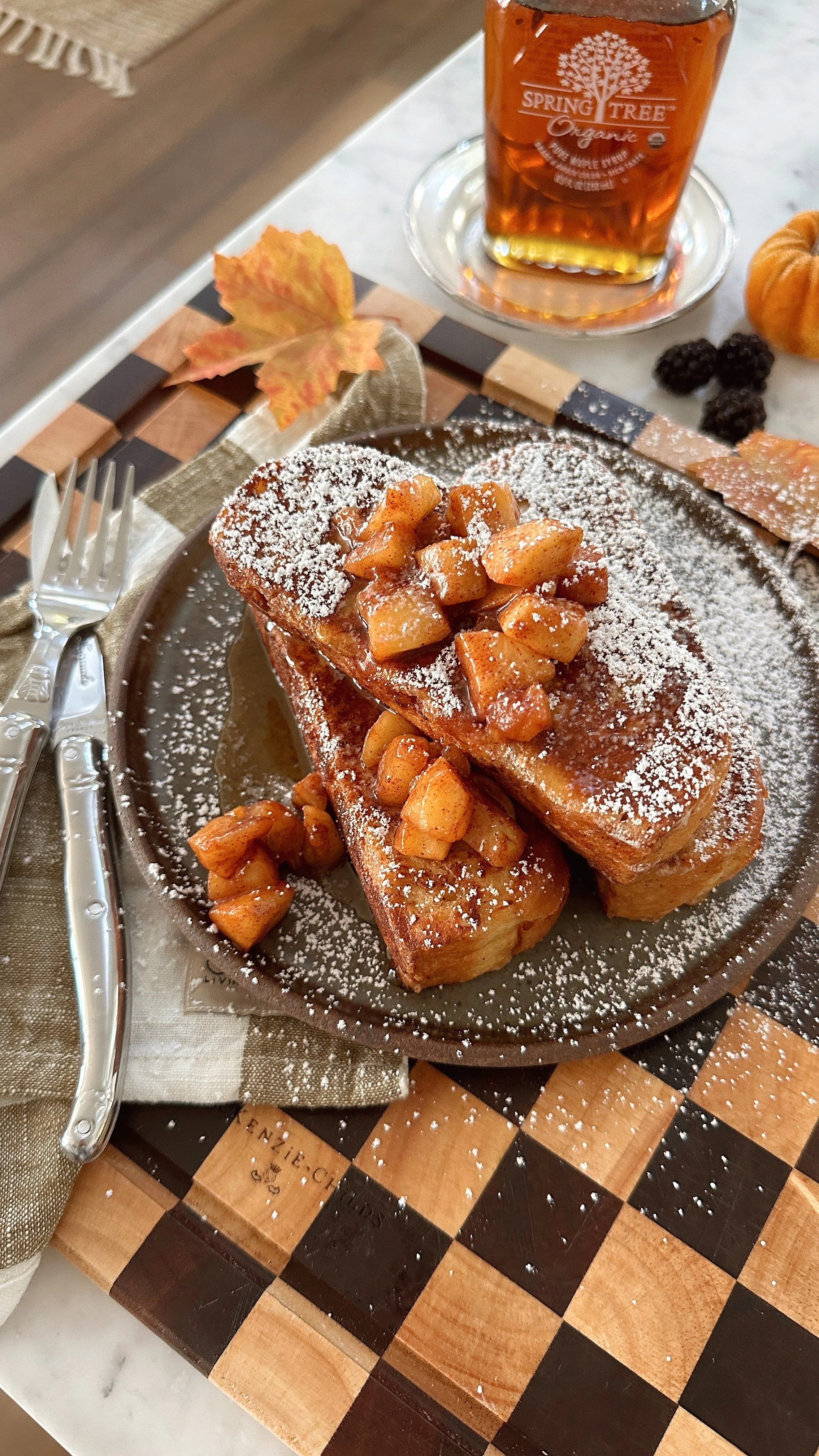 I had this idea to make apple pie stuffed French toast so we woke up this weekend and made it. It was absolutelyyyyy delicious. I couldn’t help to think it would be delicious for dessert with vanilla ice cream. Scroll down for the recipe.