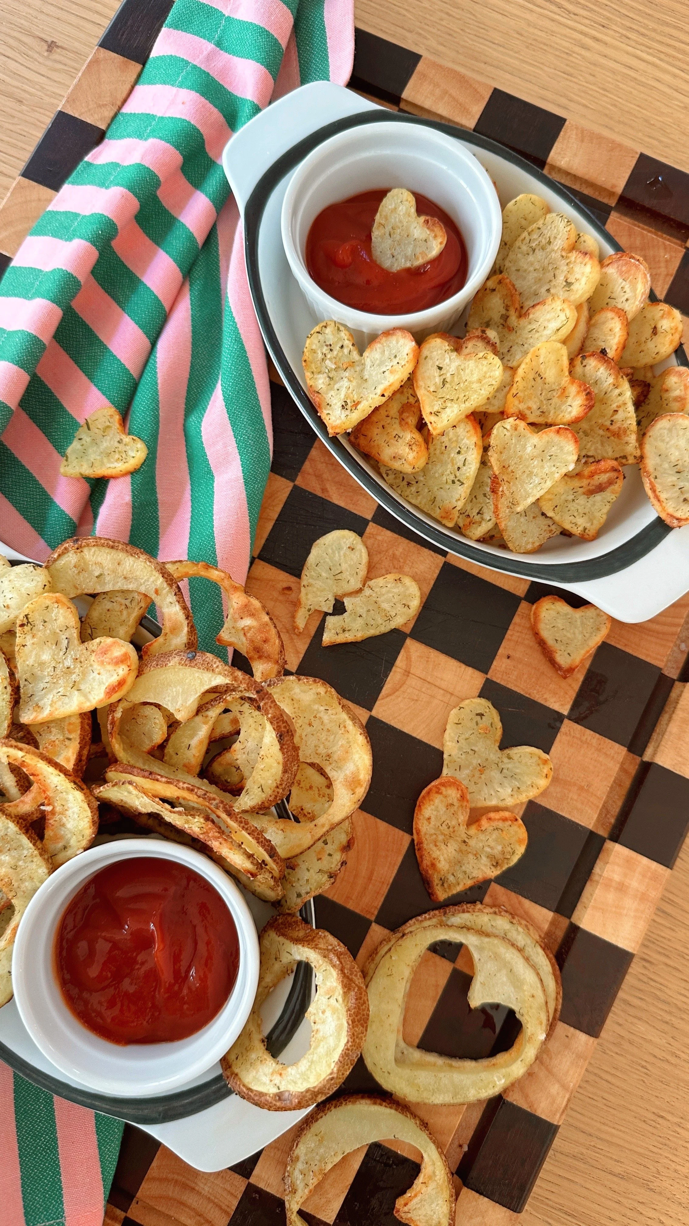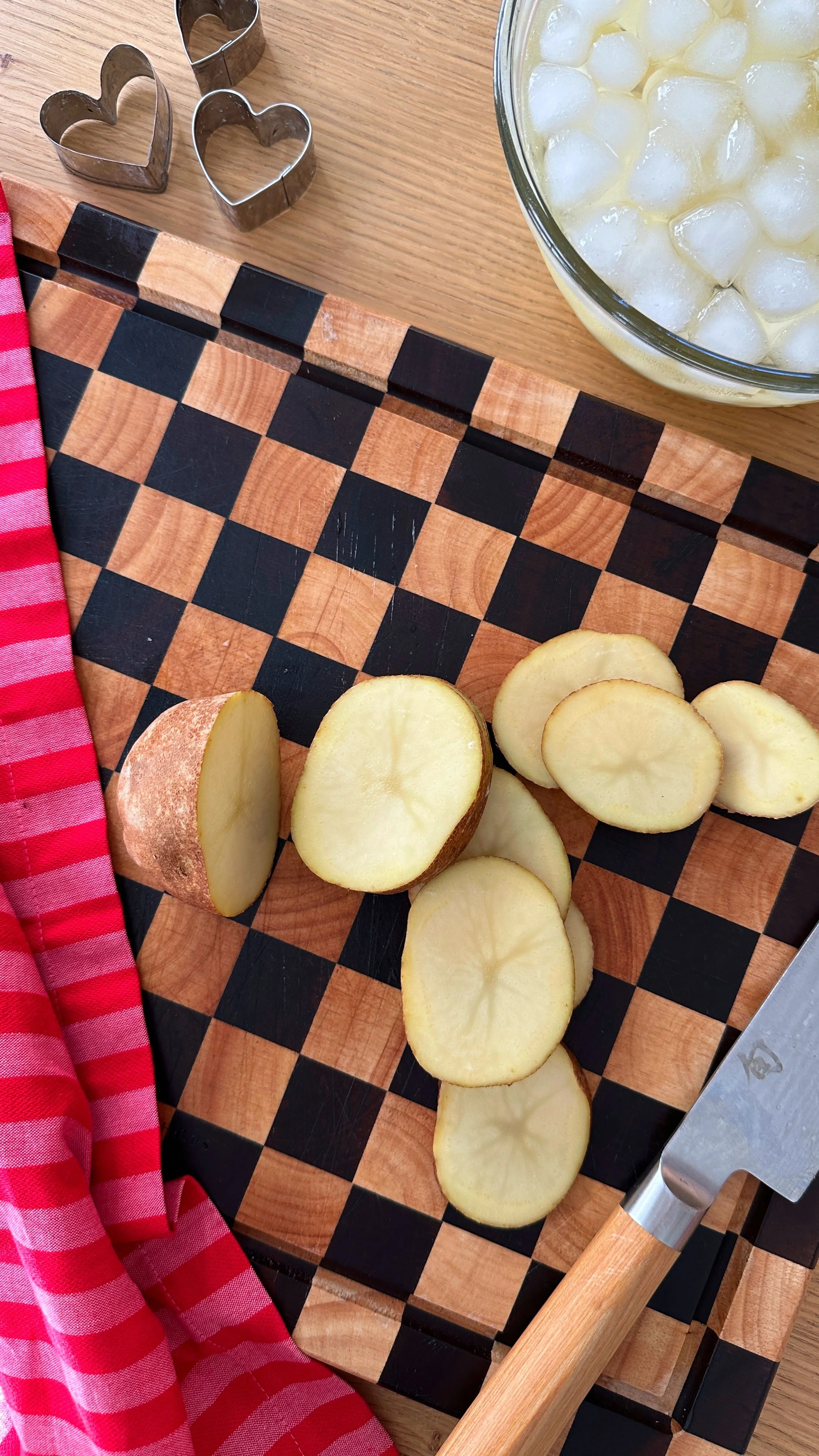 Using a mandolin or sharp knife, slice the potatoes into round discs. Use a one-two inch heart cutter (depending on how big your potatoes are) to make the heart fries.