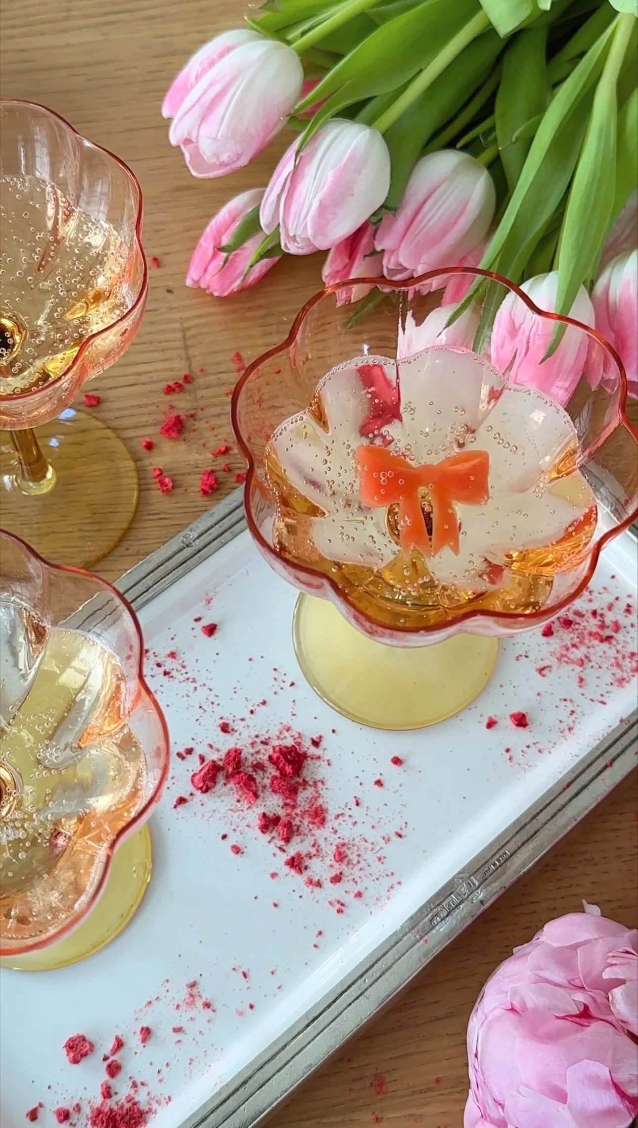 I’m obsessed with these delicate mimosas. I used Natalie’s Blood Orange Juice for the bows and they are as delicious as they are beautiful. Scroll down for the mold and tutorial!
