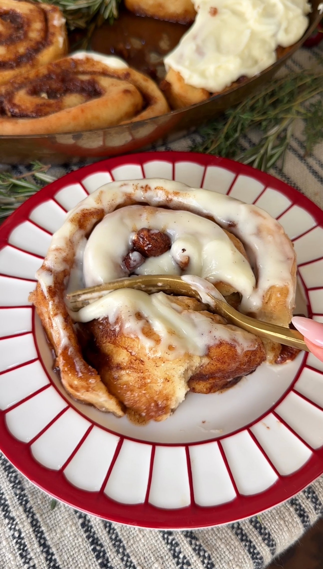 Place cinnamon rolls in a parchment lined and greased round baking pan or pan of choice. Place an upside down ramekin in the center of your dish to create the wreath shape. Cover with plastic wrap and a warm towel and let rise again for 30-45 minutes.