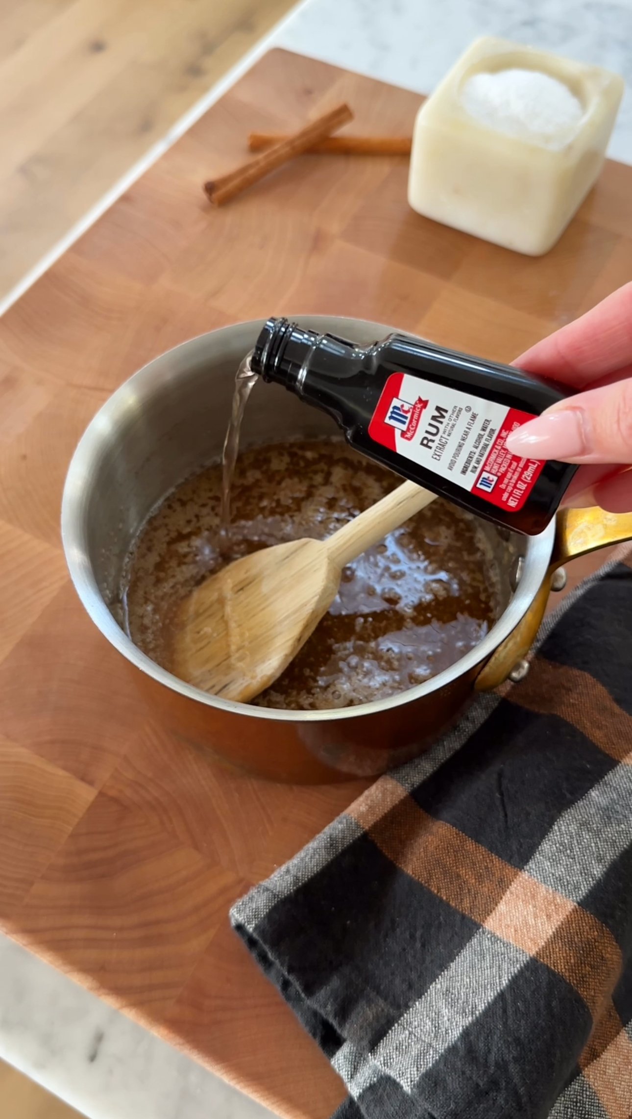 To make the Buttered Rum Sauce melt the butter over medium heat. Add the brown sugar, salt, and caramel sauce. Whisk until smooth and bubbling. Carefully stir in the McCormick® Rum Extract (mixture may bubble). Remove from heat and whisk until glossy. Let stand 15–30 minutes for a thicker glaze or pour warm over each slice. ** Once removed from the heat you may add 2 tablespoons of any thick caramel sauce for extra deliciousness (optional).