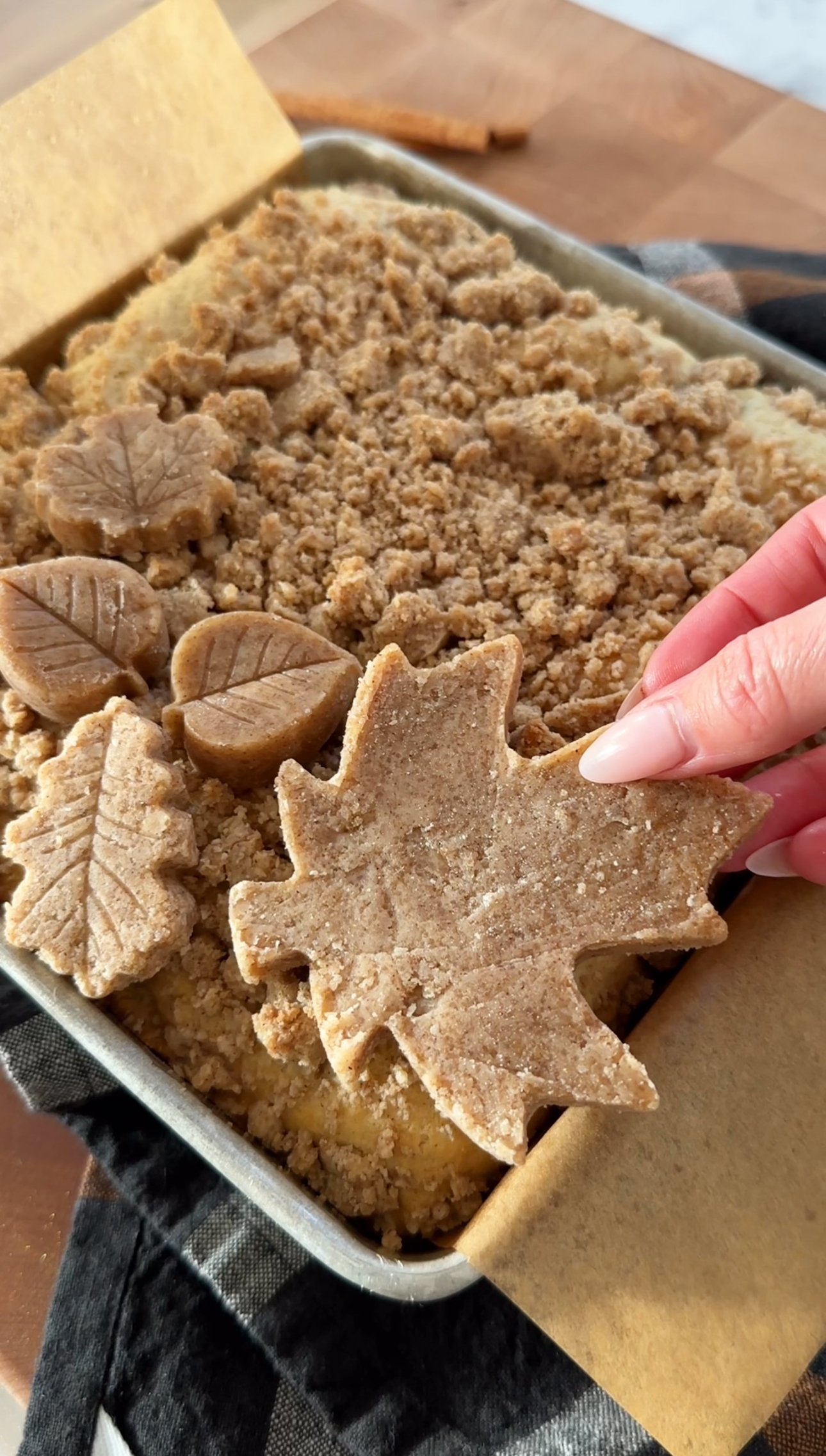 Make the crumb topping: In a large bowl, mix flour, brown sugar, granulated sugar, salt, and McCormick® Ground Cinnamon. Stir in the melted butter and McCormick® Pure Vanilla Extract until large crumbles form. Press half of the mixture into your leaf molds. If the mixture gets too cold, pop it in the microwave for thirty seconds and mold again. Freeze leaves for 45 minutes and set remaining crumbs aside.