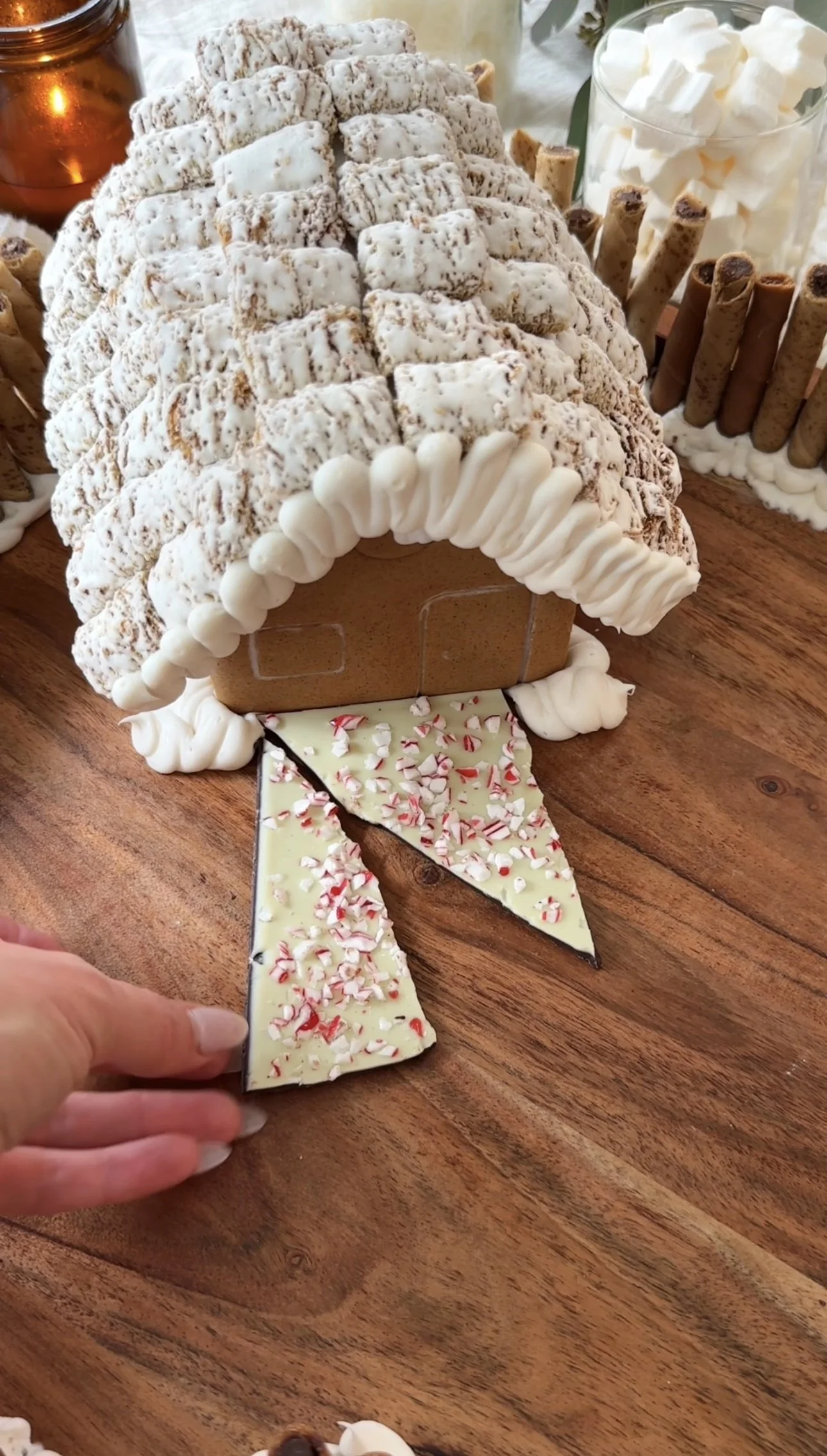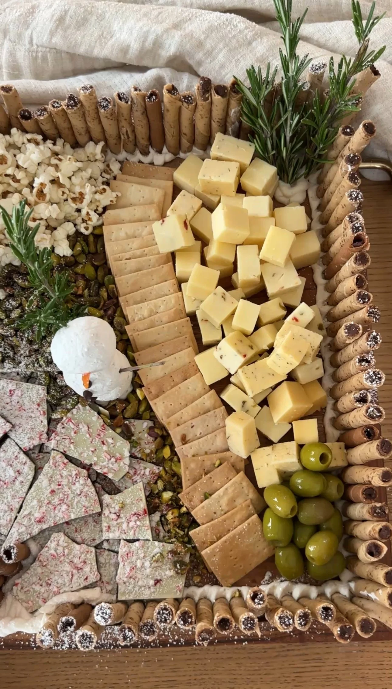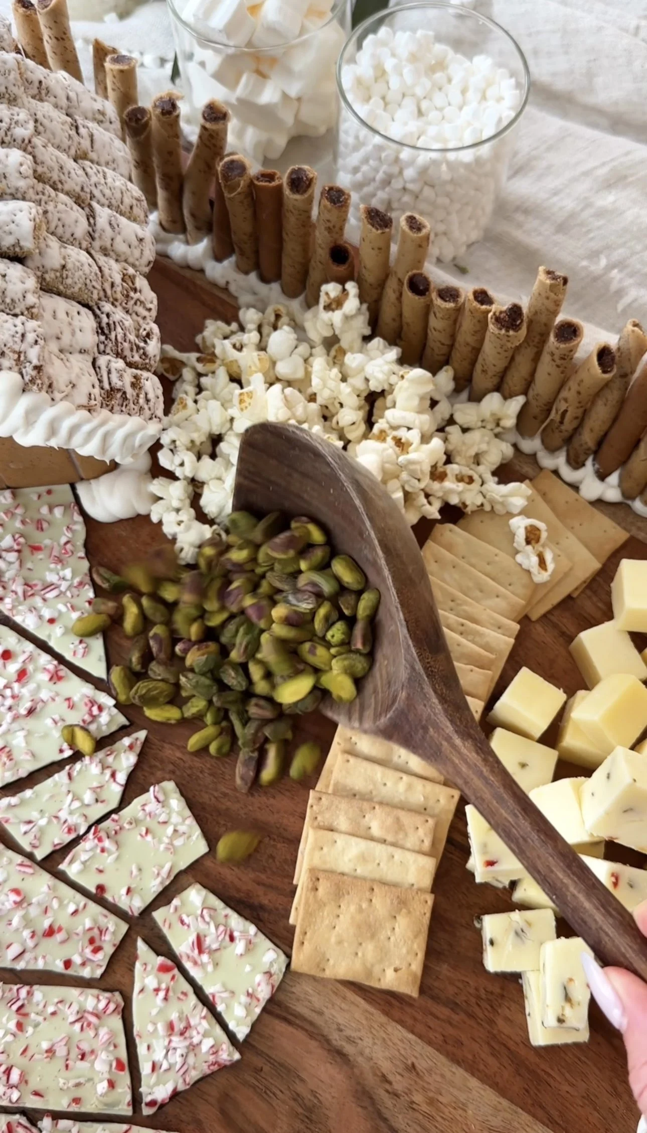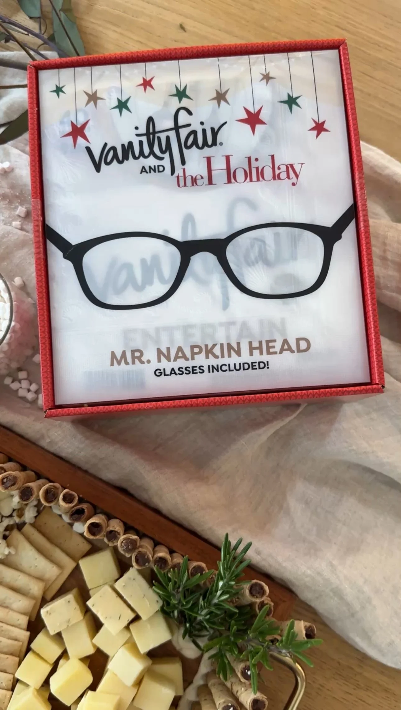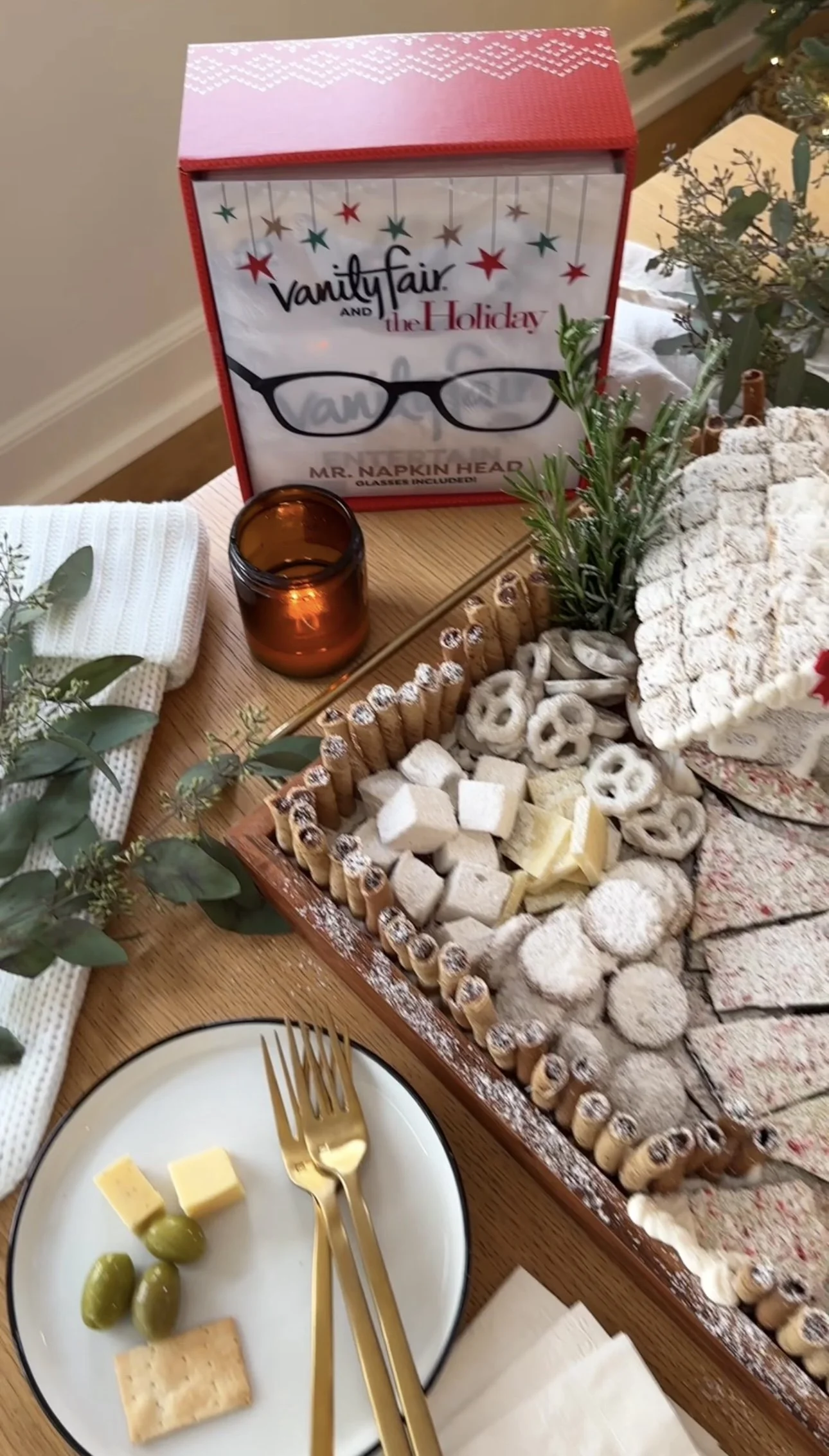 Holiday Snowy Chalet Board ❄️ with @vanityfairnapkins #ad A cozy winter scene you can actually eat. Who can guess the movie!? Soft cheeses, tiny cookies, holiday bark, and sweets dusted in powdered sugar. Perfect for any holiday gathering — and it pairs perfectly with Vanity Fair® Entertain Holiday Napkins, because they elevate any occasion and every bite should be #NapkinWorthy. Order your Vanity Fair x The Holiday Mr. Napkin Head party pack just in time for the holidays!