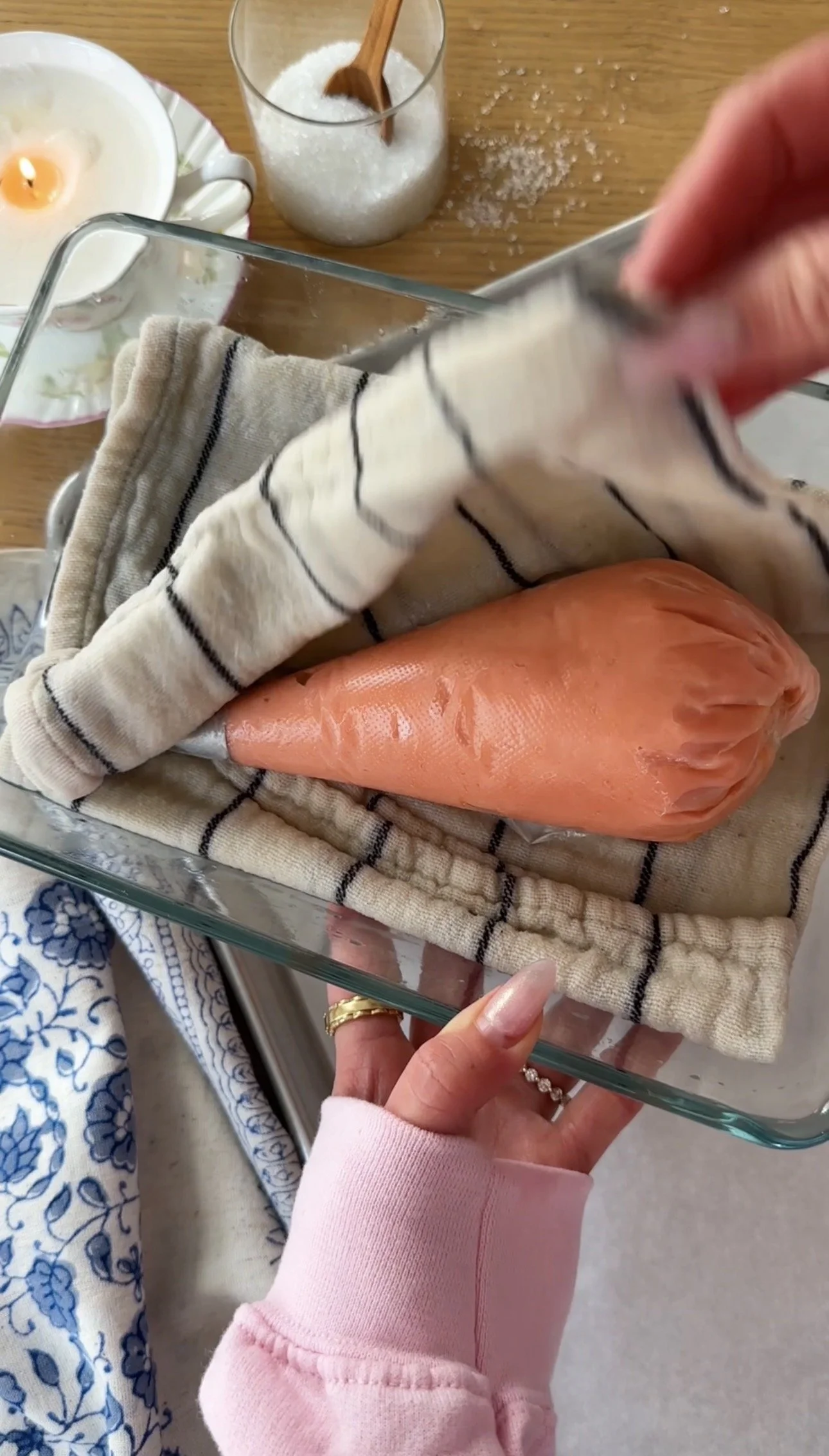 If you keep the piping bag under a hot towel (I added boiling water to my towel) it keeps the cookie batter warm and makes it easier to pipe as sometimes the butter will make the batter firm. Just use a paper towel to dry the bag each time or it will be slippery and difficult to hold.