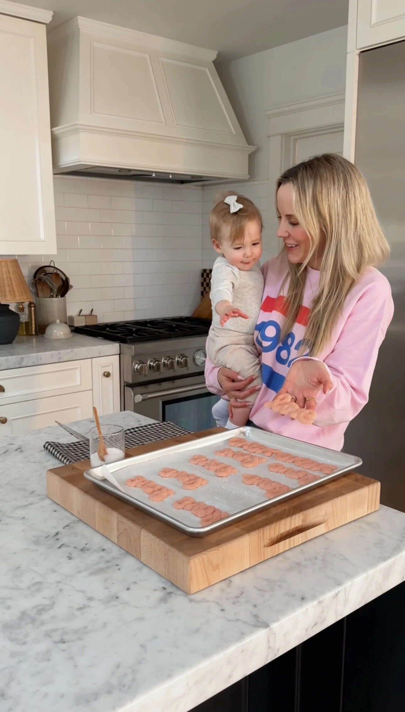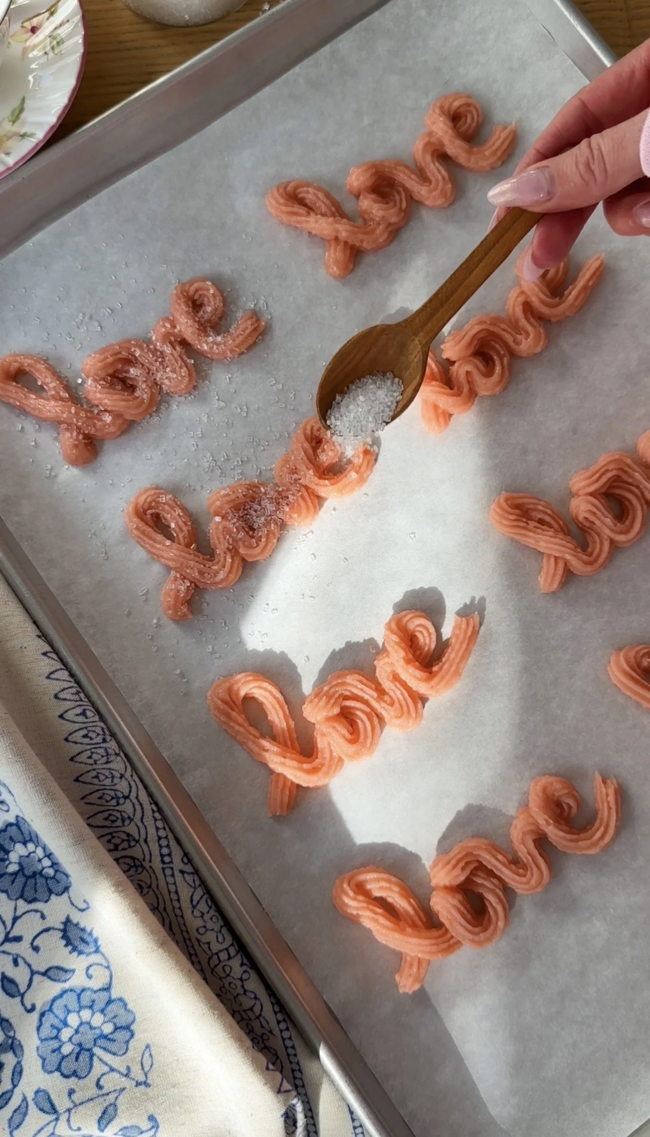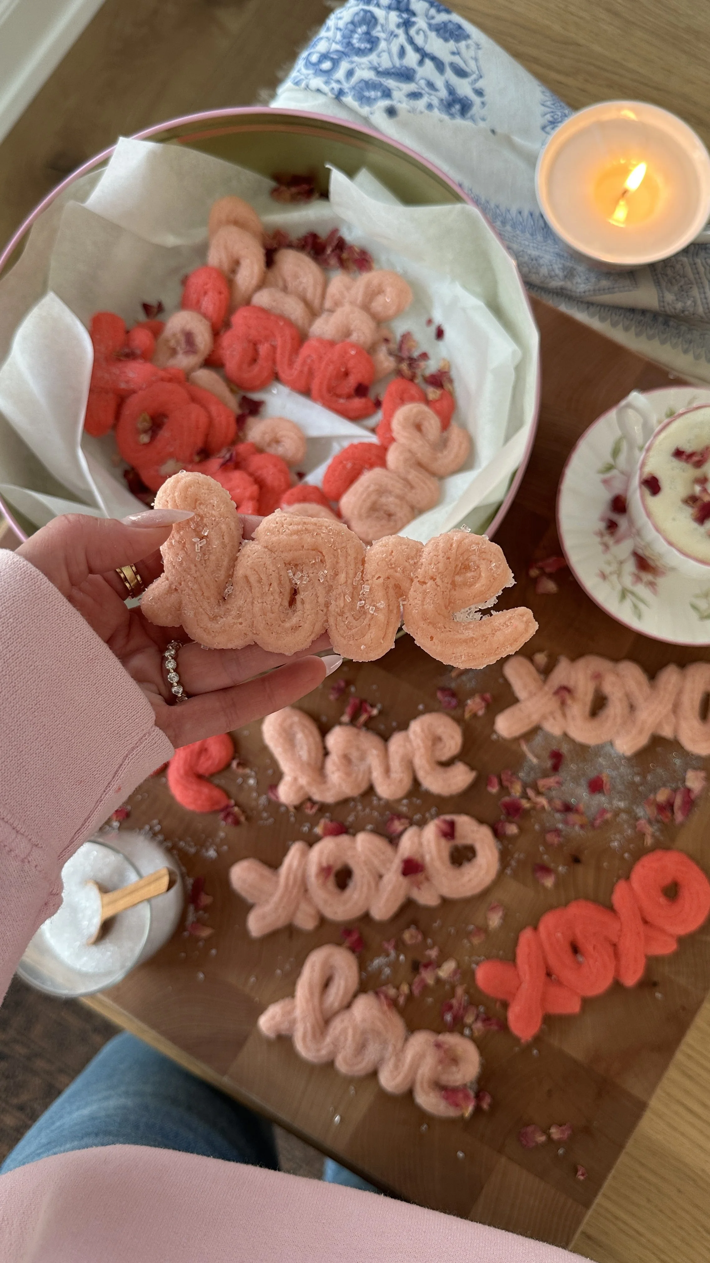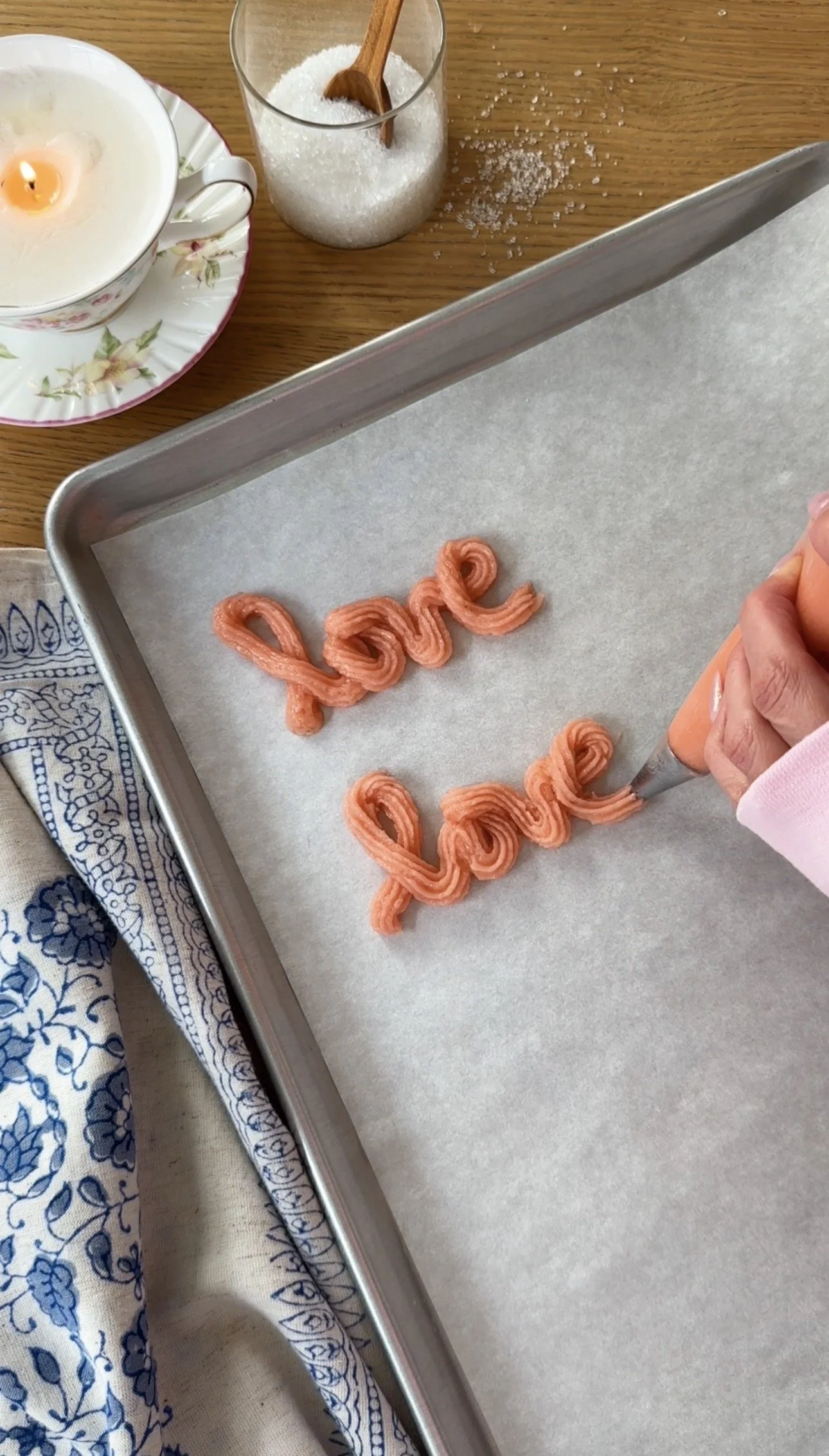Transfer the dough to a piping bag fitted with a large star tip. Pipe the word LOVE in a horizontal line onto a parchment-lined baking sheet, spacing each one about 2 inches apart. If the dough feels stiff and tricky to pipe, warm it up by wrapping the piping bag in a towel that’s been soaked in hot (boiling) water and wrung out. Let it sit for a minute or two until you can pipe again. Dust in sanding sugar if desired.