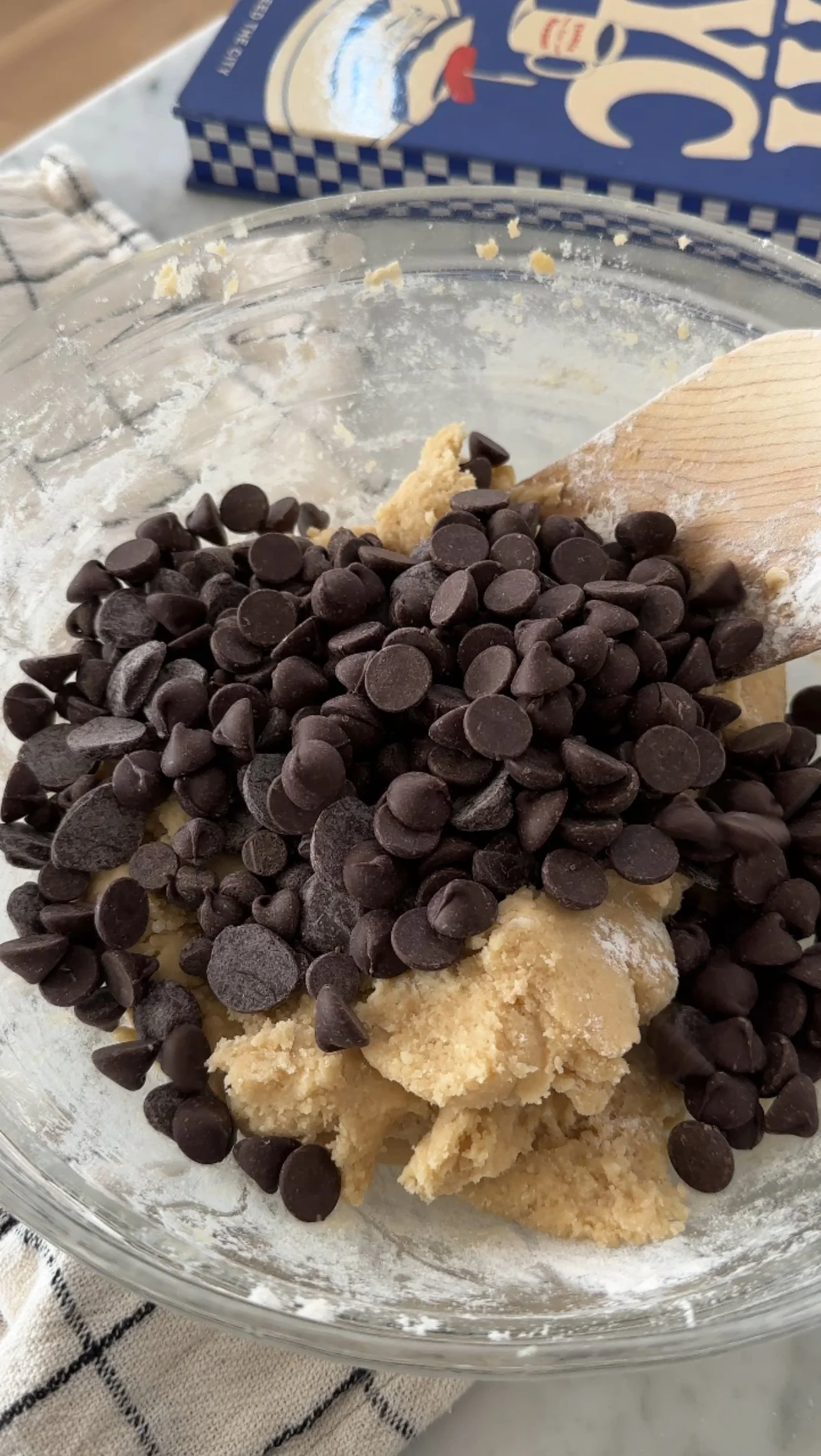 Stir in baking powder and baking soda followed by the flours. Mix until just combined. Do not over mix. Stir in both cups of chocolate chips.