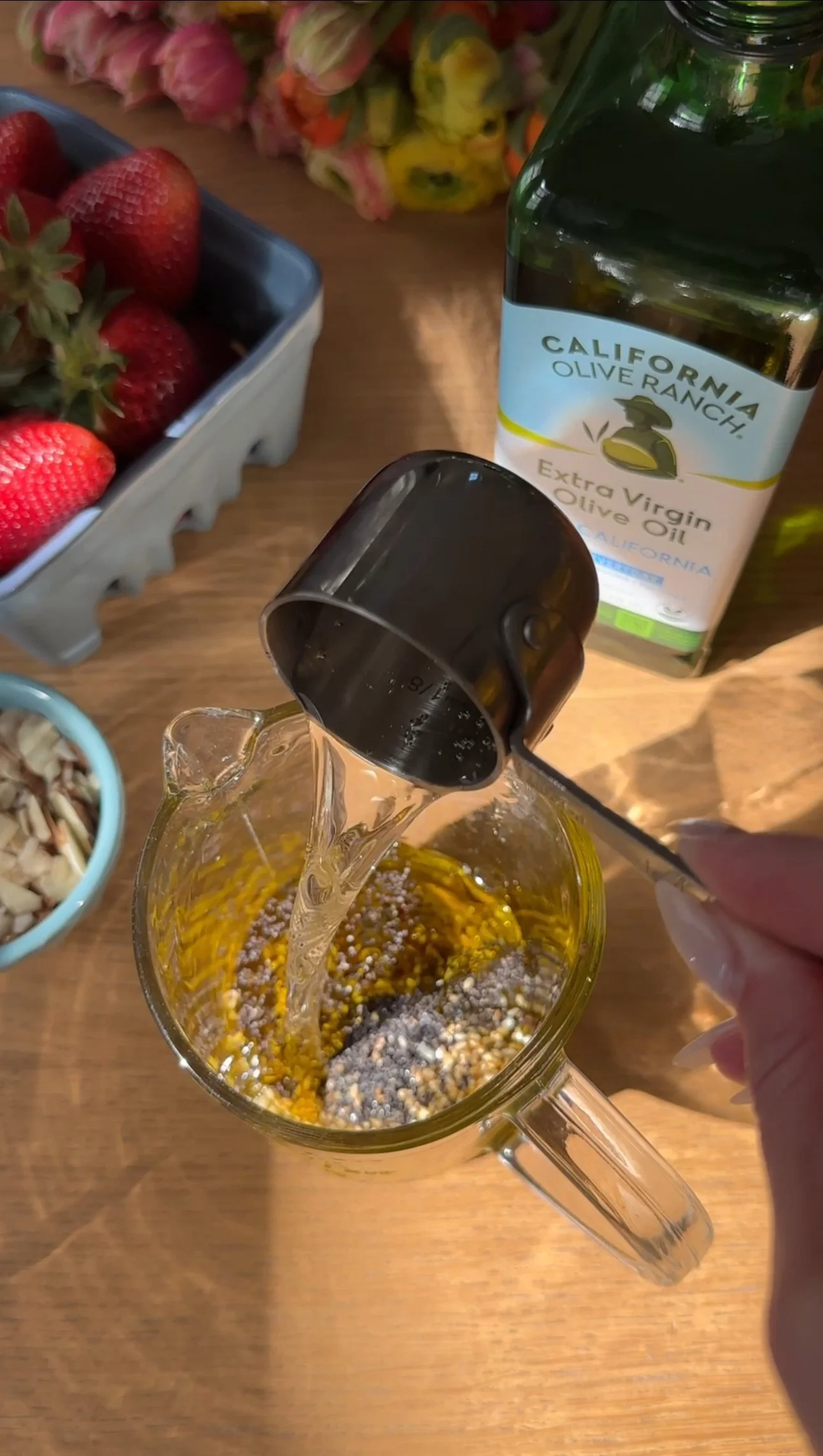 To make the dressing whisk together olive oil, vinegar, sesame seeds, poppy seeds, dried onion, sugar, and Worcestershire in a medium bowl. Cover and refrigerate for about 1 hour or until ready to serve. *You can also blend everything together for a thicker dressing.