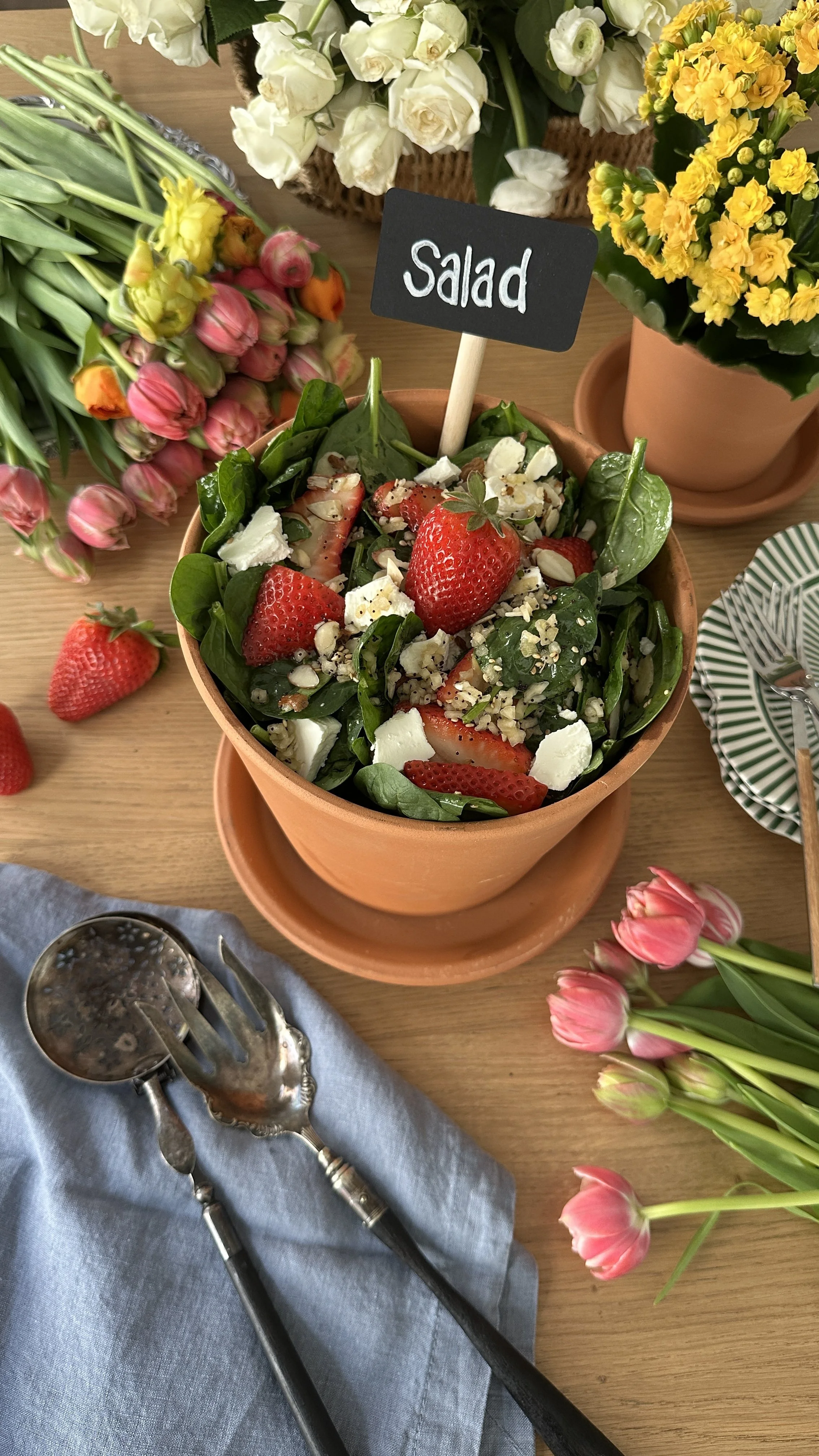 Toss the dressing with the spinach, then add sliced strawberries and almonds. Toss again and add salad to your flower pot. Top with more sliced almonds and goat cheese crumbles. Serve immediately.