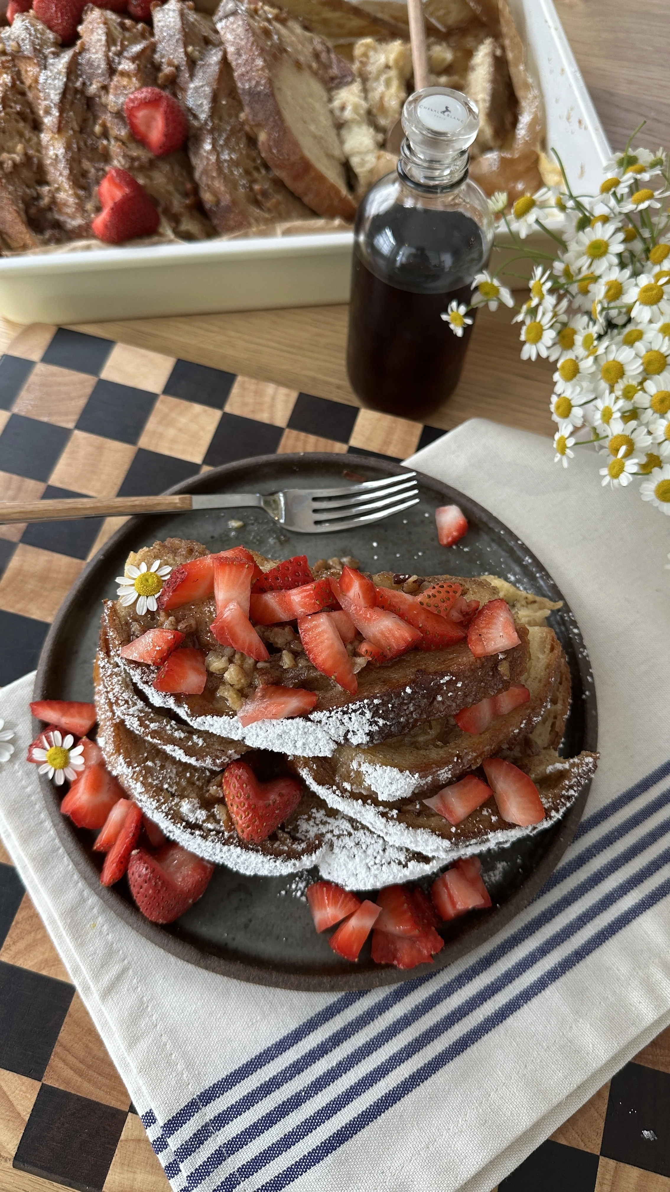 4. Spread topping evenly over the bread and bake for 35 minutes, until lightly golden brown. Serve with maple syrup.