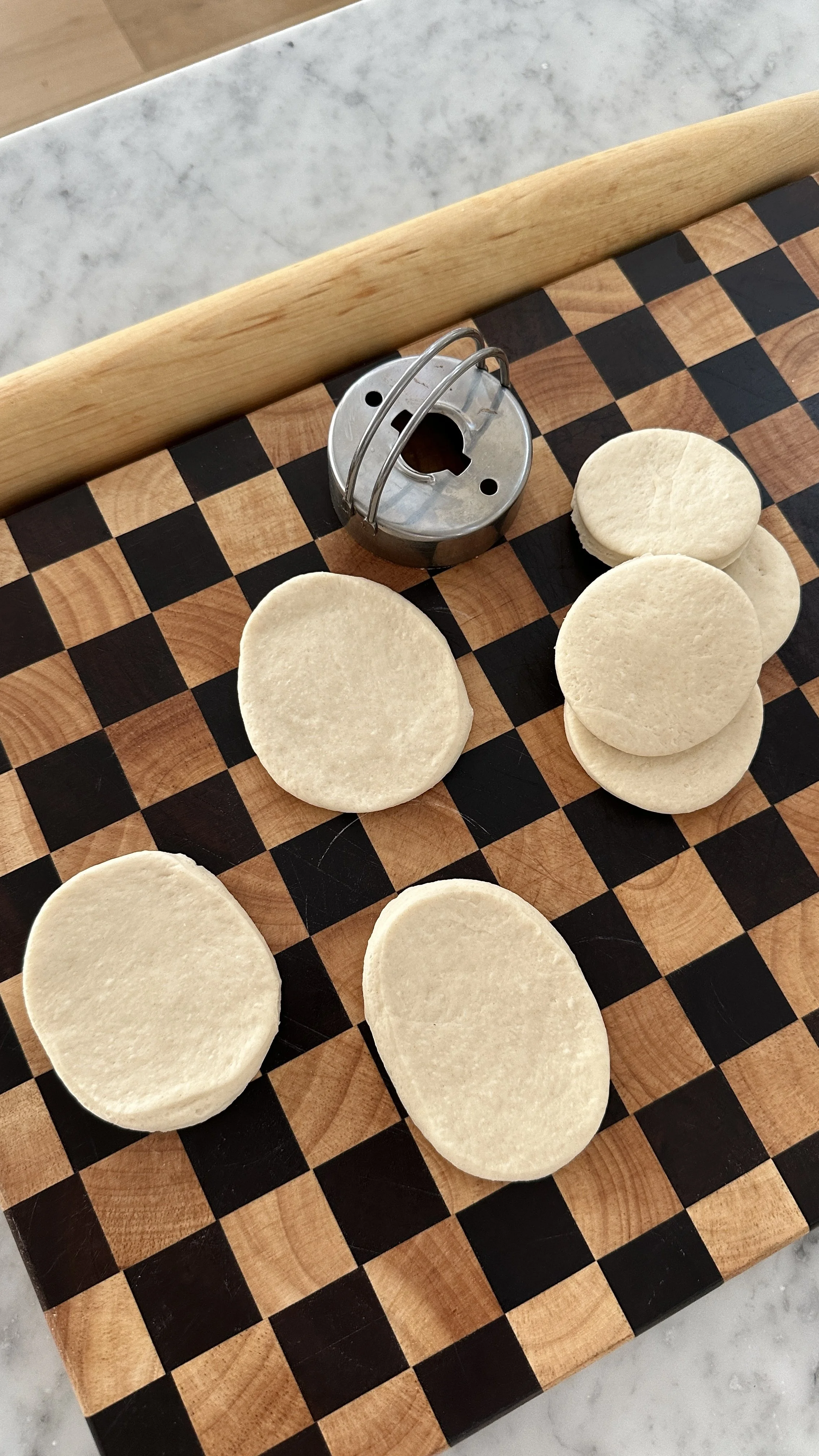 Flatten the dough with a rolling pin into a rectangle, about β inch (Β½ cm) thick. Use a large round cutter to cut out circles, then roll each piece into an oval shape. Combine the leftover dough and repeat to cut out more (dust with flour when necessary to prevent sticking). Brush oil over half of the oval then fold over lengthways.