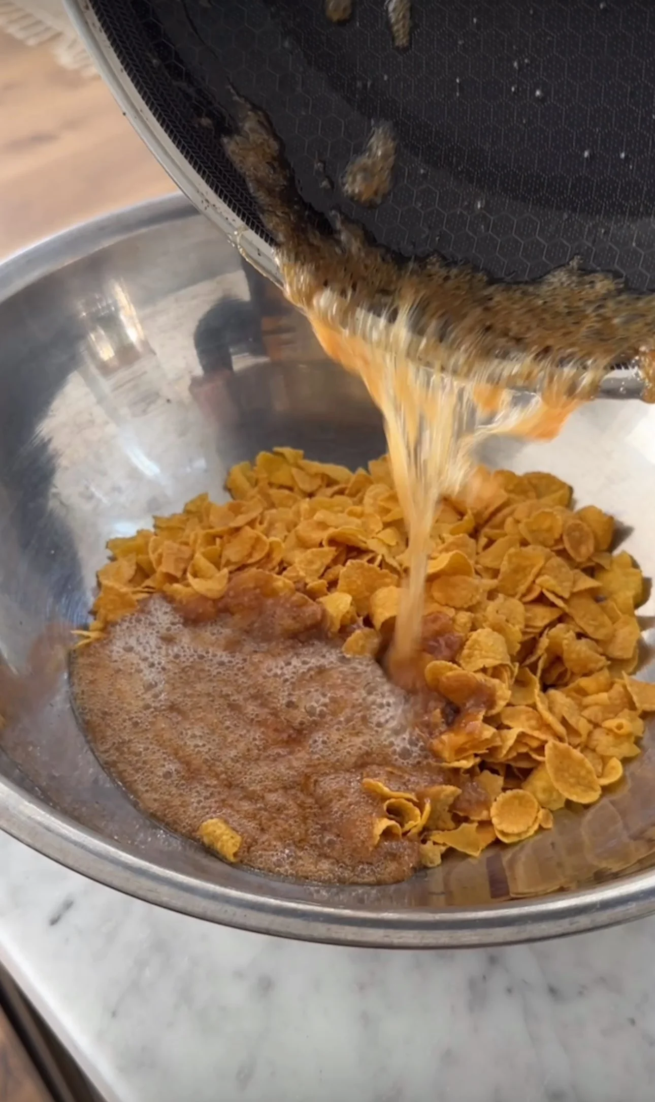 Remove from heat and gently fold in the cornflakes, making sure they’re fully coated in the mixture. Preheat oven to 350 F.