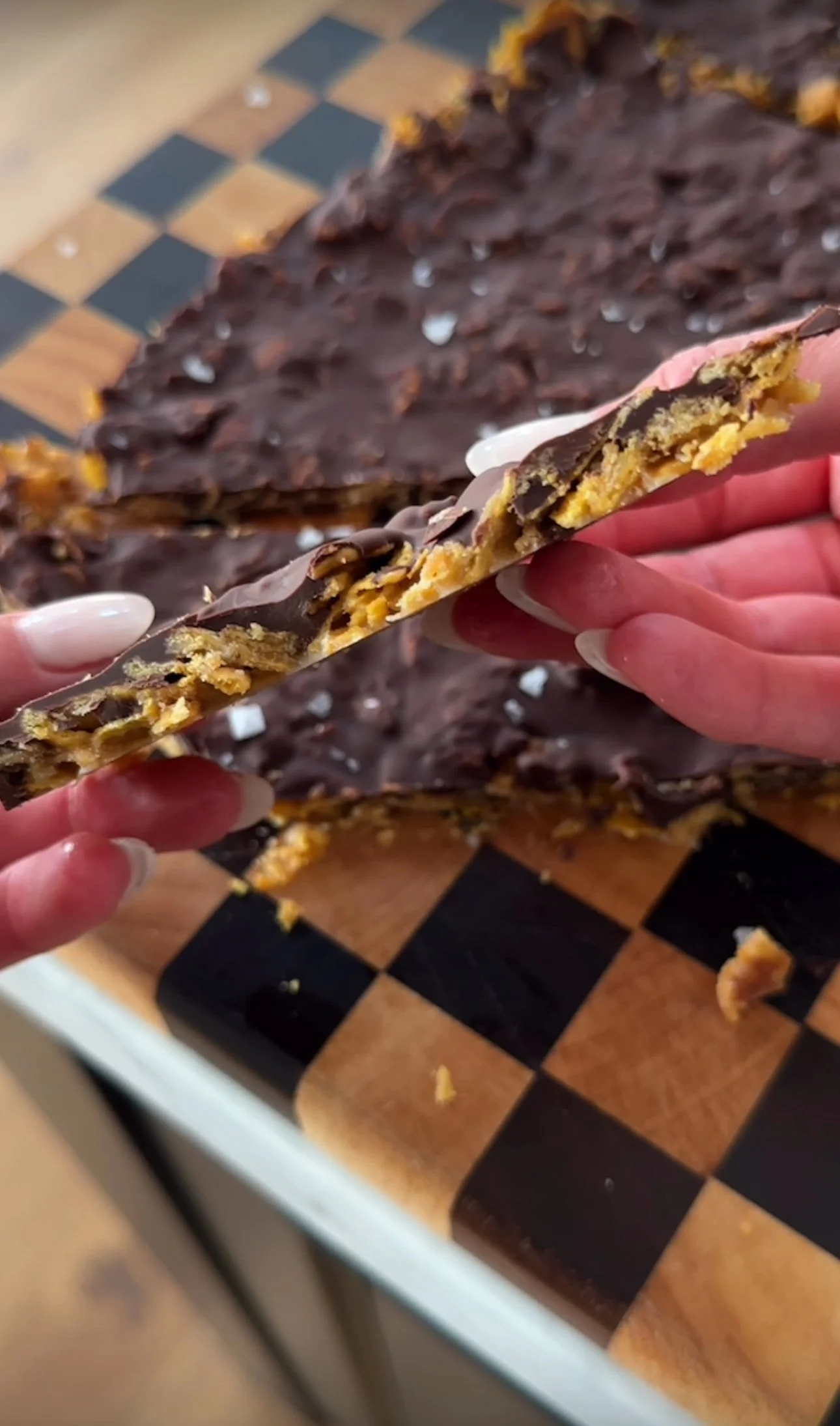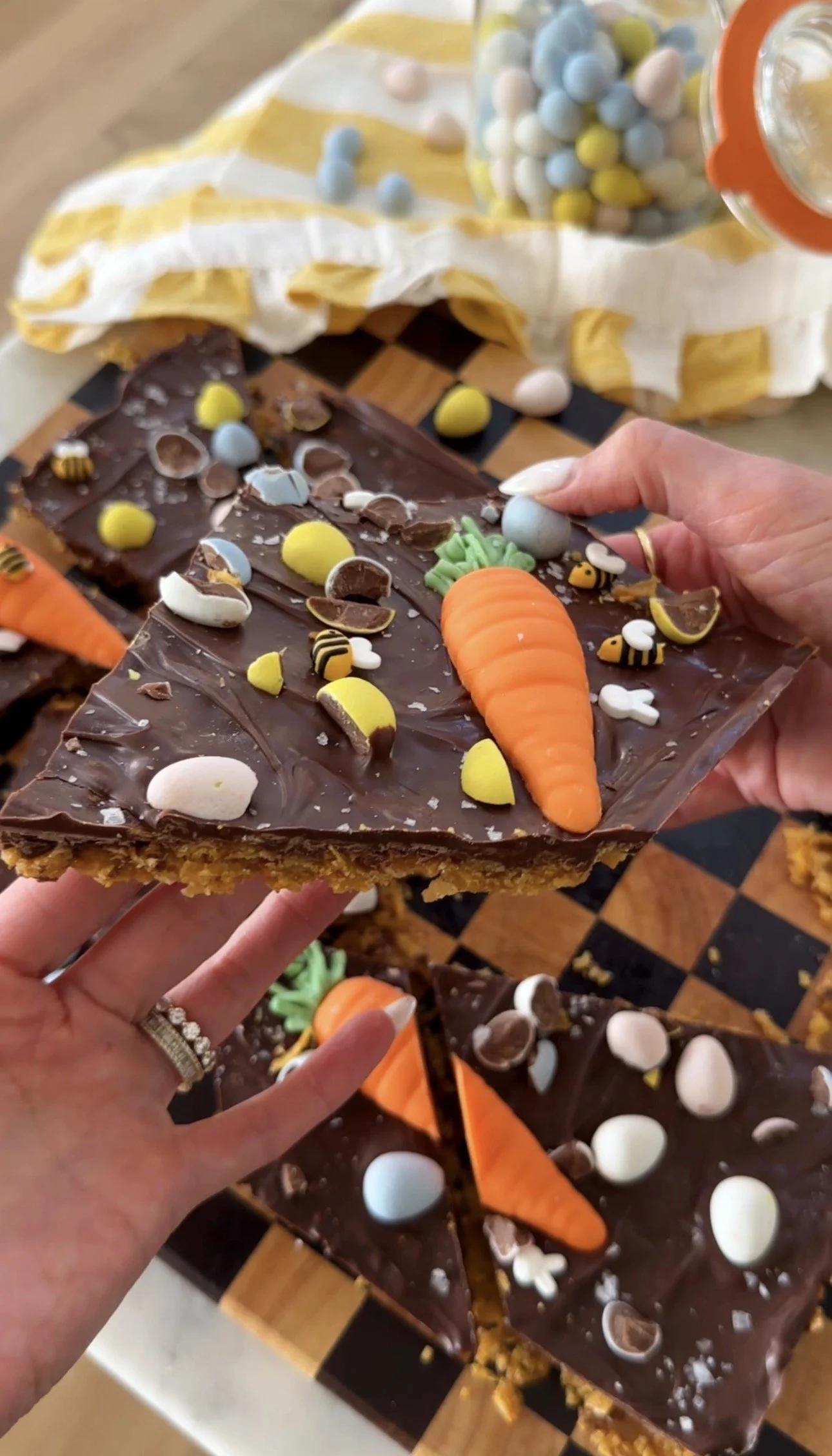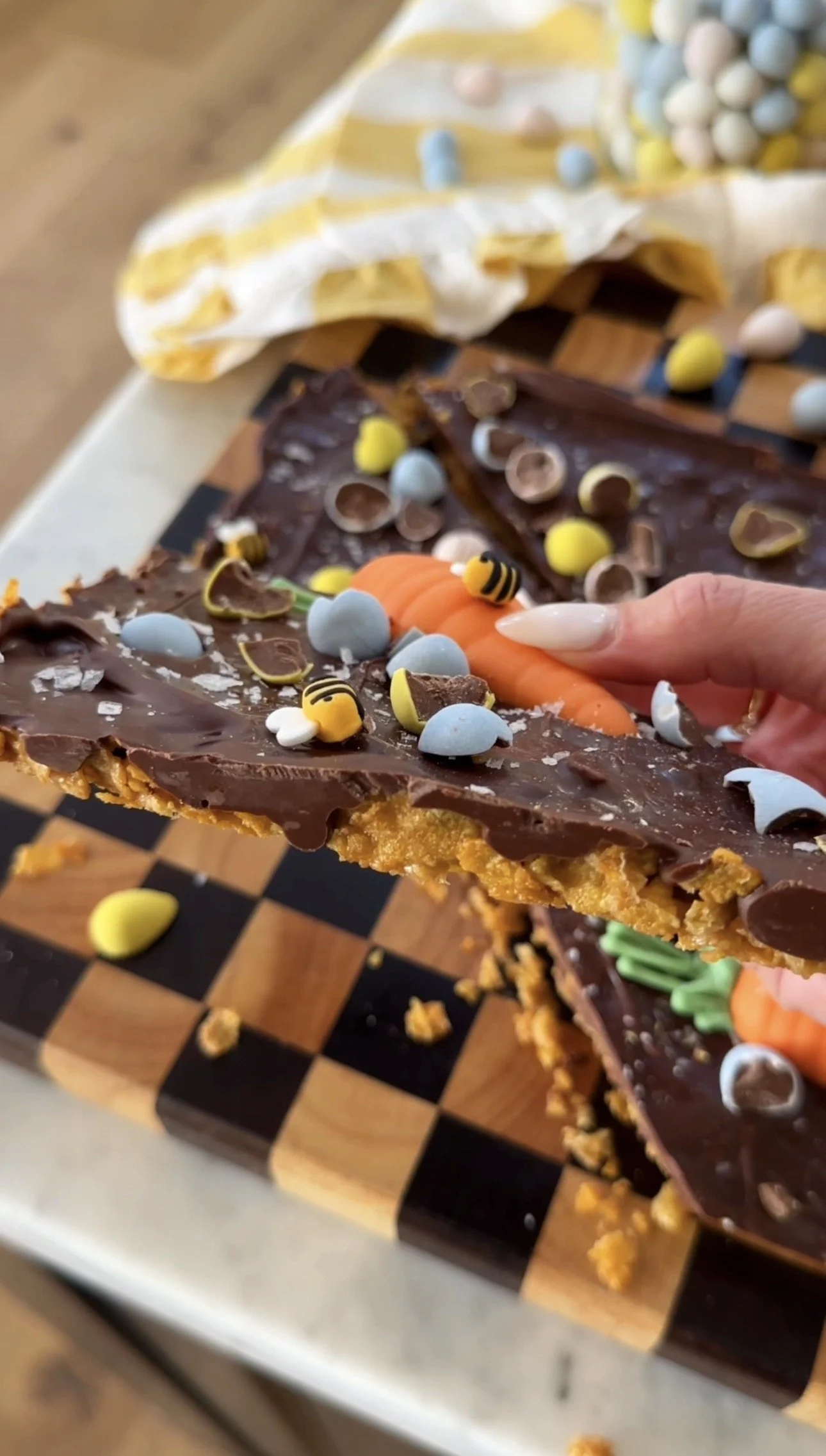 Pour melted chocolate evenly over the top and use a spatula to evenly coat. Top with flake salt, sprinkles, and/or chopped chocolate Easter eggs. Refrigerate for ten minutes or until firm.