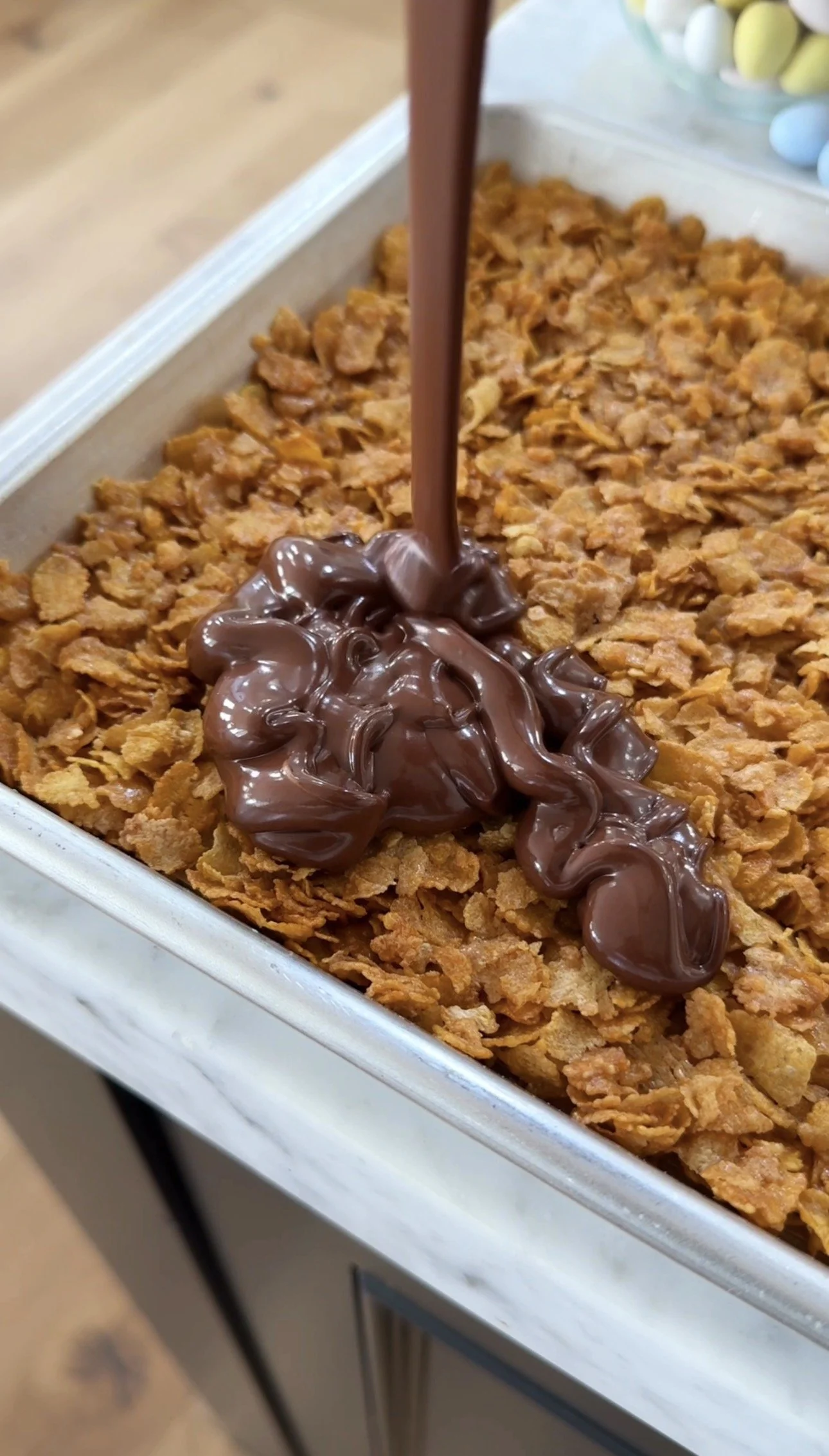 Flatten cornflakes on the entire lined baking sheet and bake at 350 F for 8 minutes. Remove from oven and allow to cool on counter or in fridge for 30 minutes.
