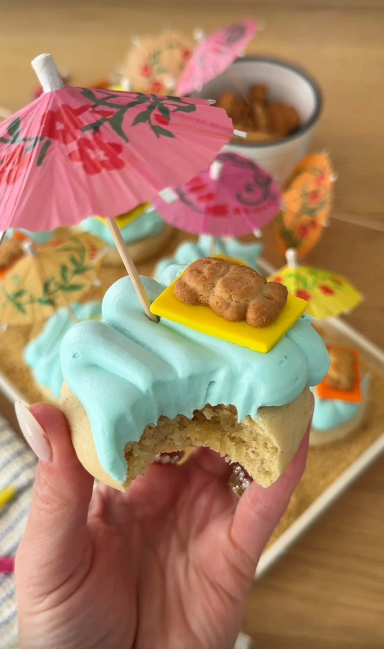 Use a piping bag to frost each cookie. Roll out your colored fondant and cut tiny rectangles big enough to fit the graham cracker bears. Add one fondant towel and a graham cracker bear to each cookie. (You can dab some frosting on the back of each bear so it doesn’t slide off the towel) Add paper umbrellas if desired.