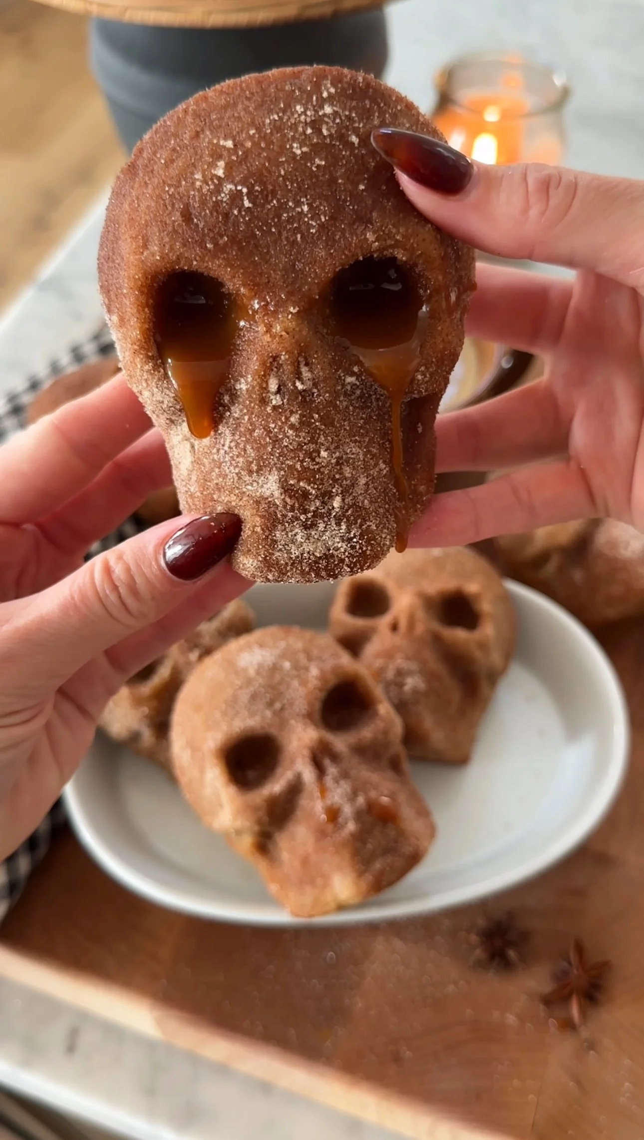 Apple Cider Baked Donuts made in a spooky skull mold! Sweet, cinnamon-sugar coated, and perfect for fall baking or a Halloween treat. ๐๐