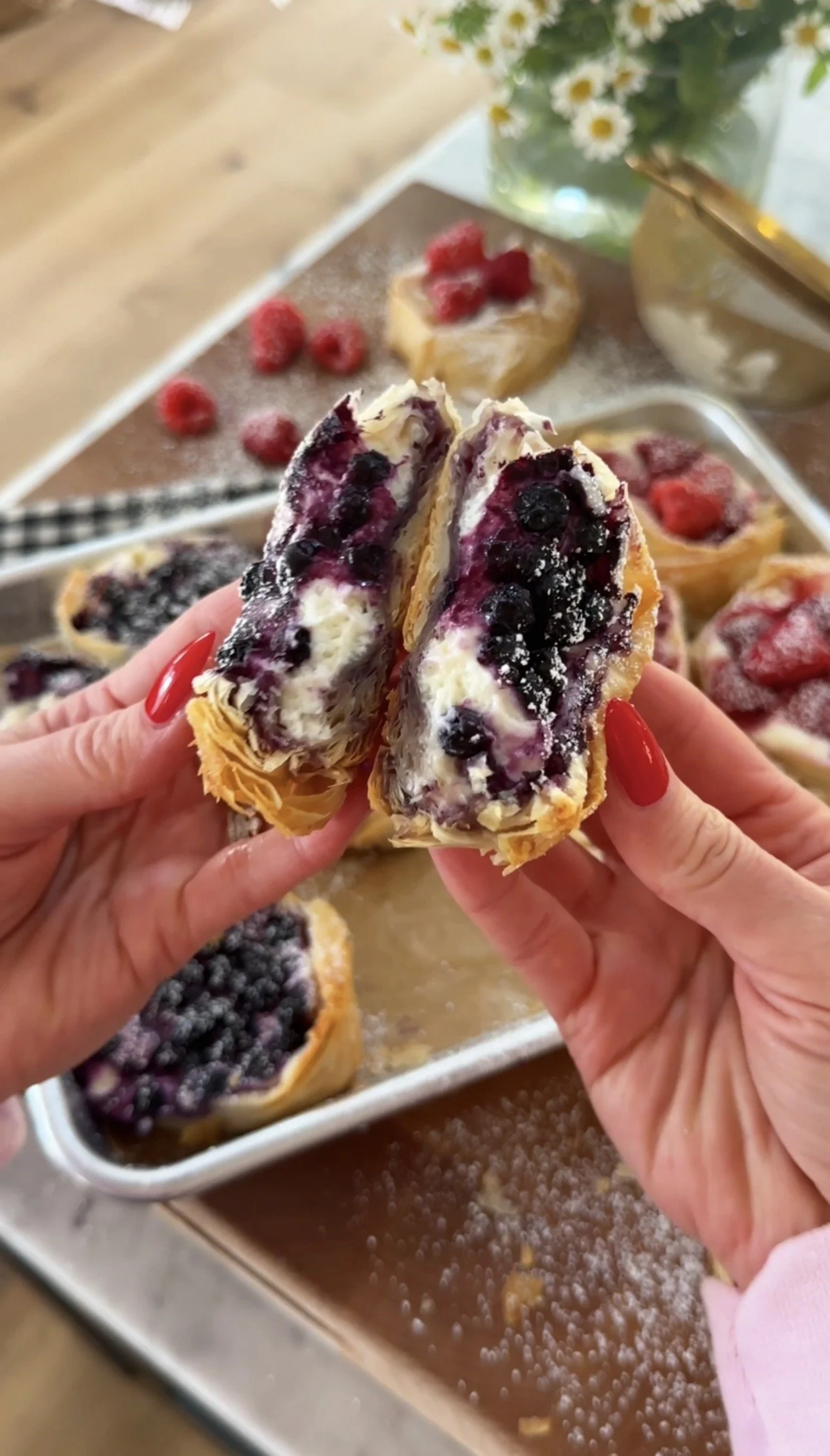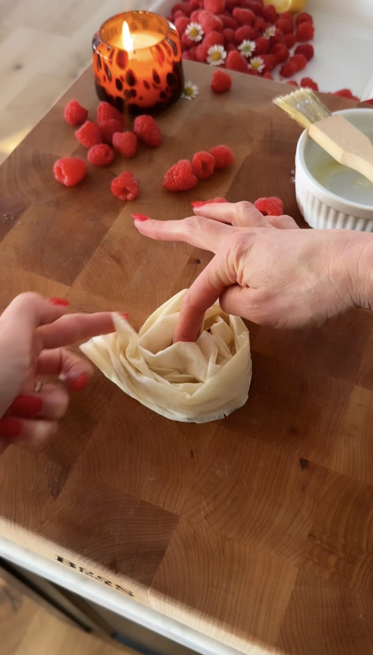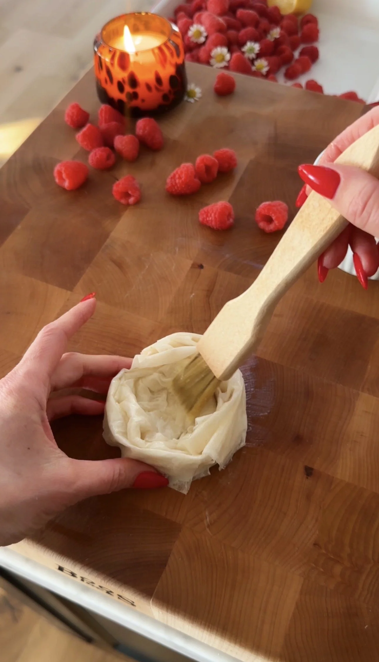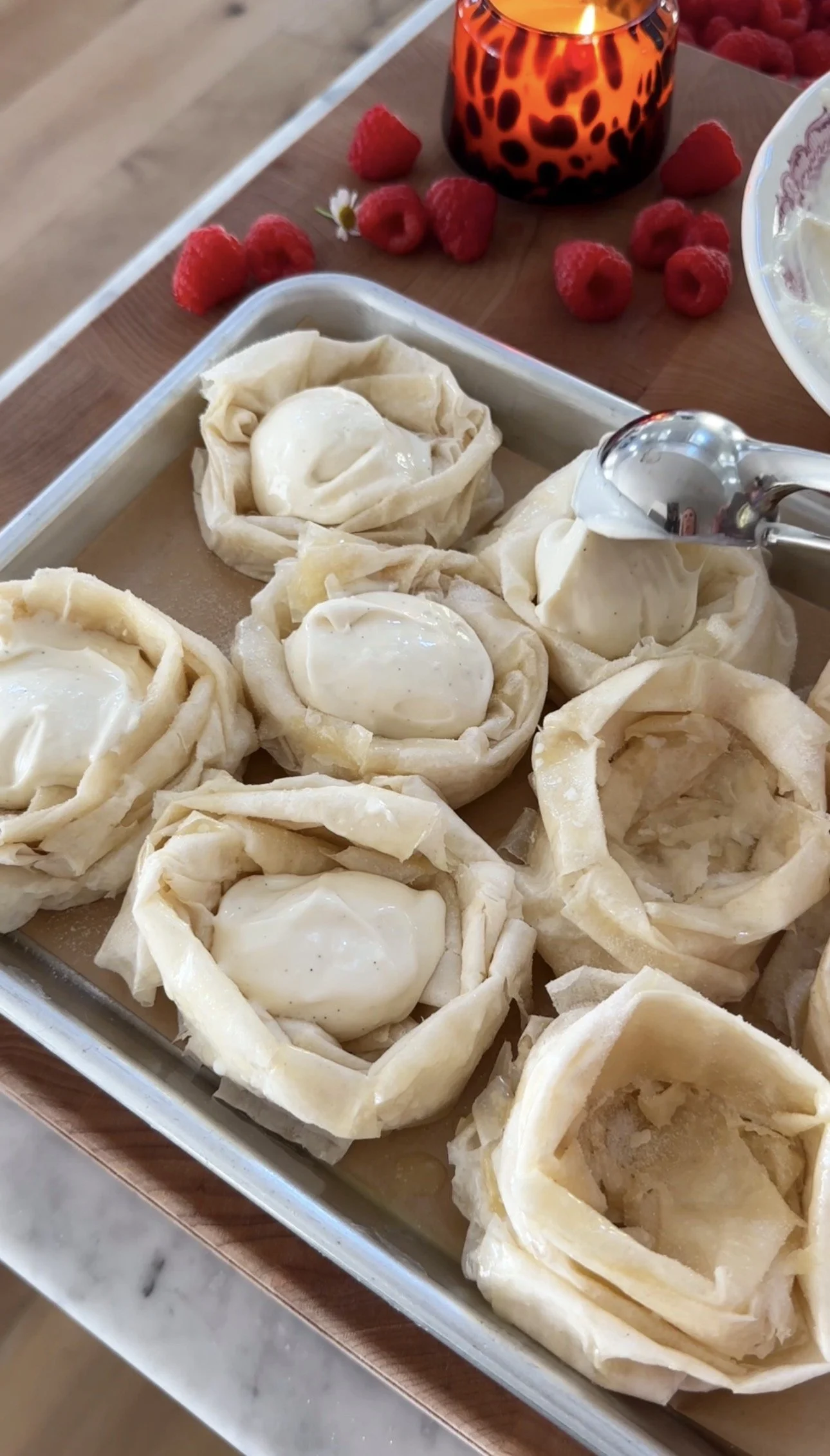 Spoon the filling into the phyllo shells. Top generously with blueberries or raspberries, pressing them lightly into the filling.