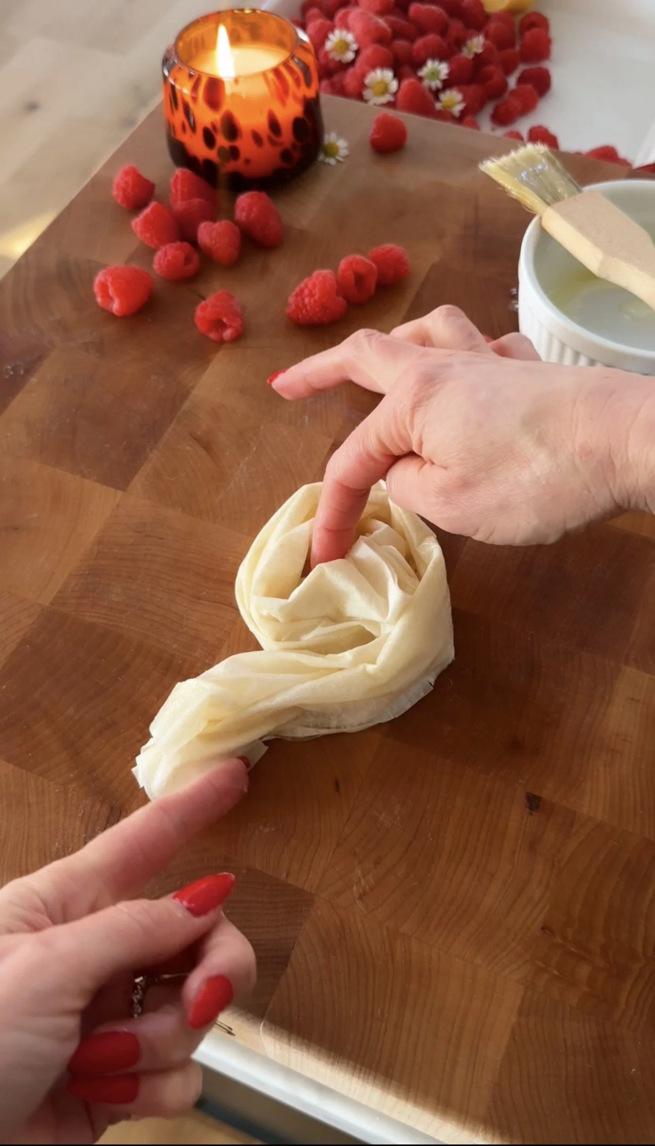 Preheat oven to 400°F and lightly grease two muffin tins or line a large baking sheet with parchment paper. Layer two phyllo pastry sheets at a time, brushing each layer with melted butter. Fan the two sheets together horizontally and shape into a round. Gently press down the center of the round with your fingers or brush to create a nest shape.