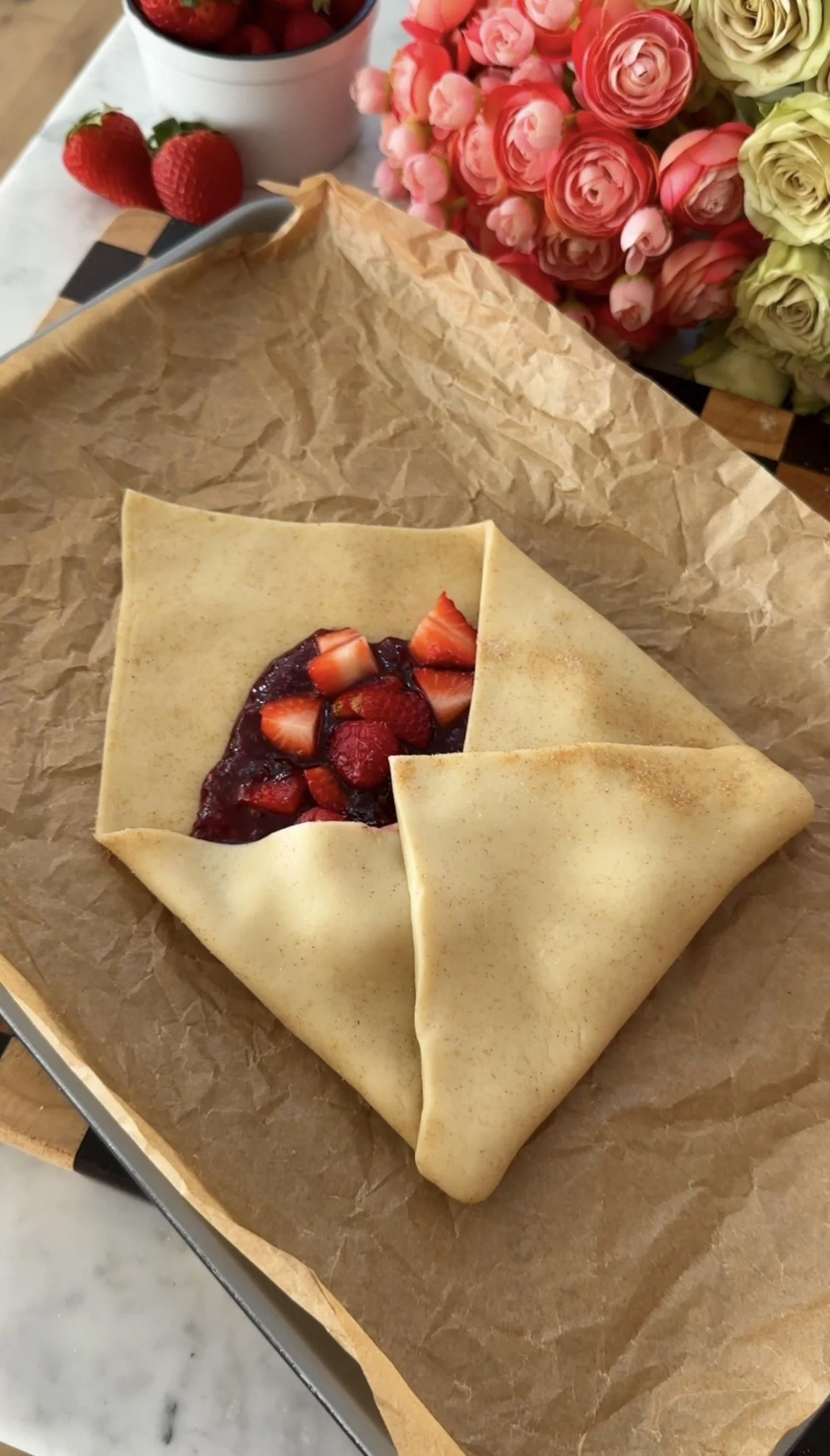 Transfer the pastry square to the prepared baking sheet (do not leave it on the cutting board like me 😆) and turn slightly sideways so it looks like a diamond in the center of the baking sheet with one corner pointing towards the top of the baking sheet. Scoop preserves into the center of the pie crust and add a 1/2 cup of raspberries and the sliced strawberries (saving 1 cup raspberries and all of the whole strawberries for finishing after baking). Add lemon zest if using.