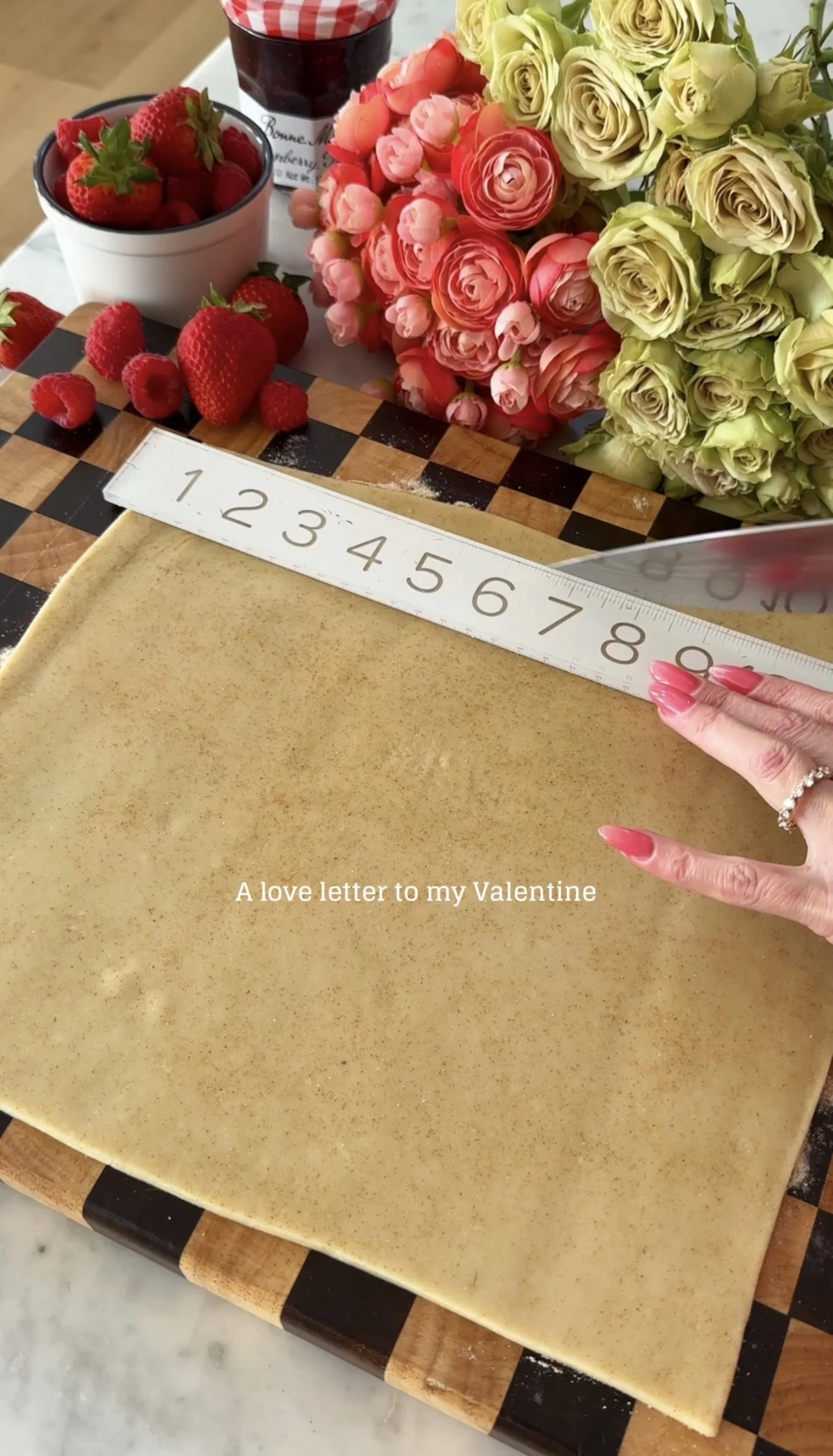 Transfer the pastry square to the prepared baking sheet and turn slightly sideways so it looks like a diamond in the center of the baking sheet with one corner pointing towards the top of the baking sheet. Scoop preserves into the center of the pie crust and add a handful of raspberries (about 1/2 cup) and sliced strawberries. Save 1 cup of the raspberries and all of the whole heart shaped strawberries for finishing after baking). Add lemon zest to the center of the preserves if using.