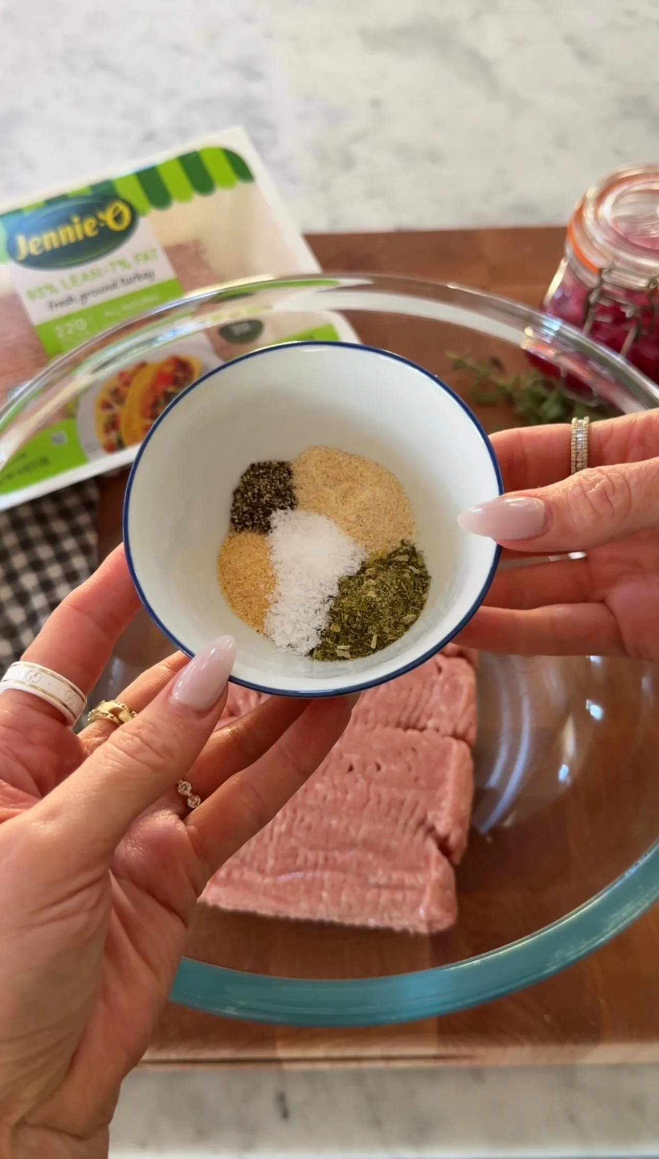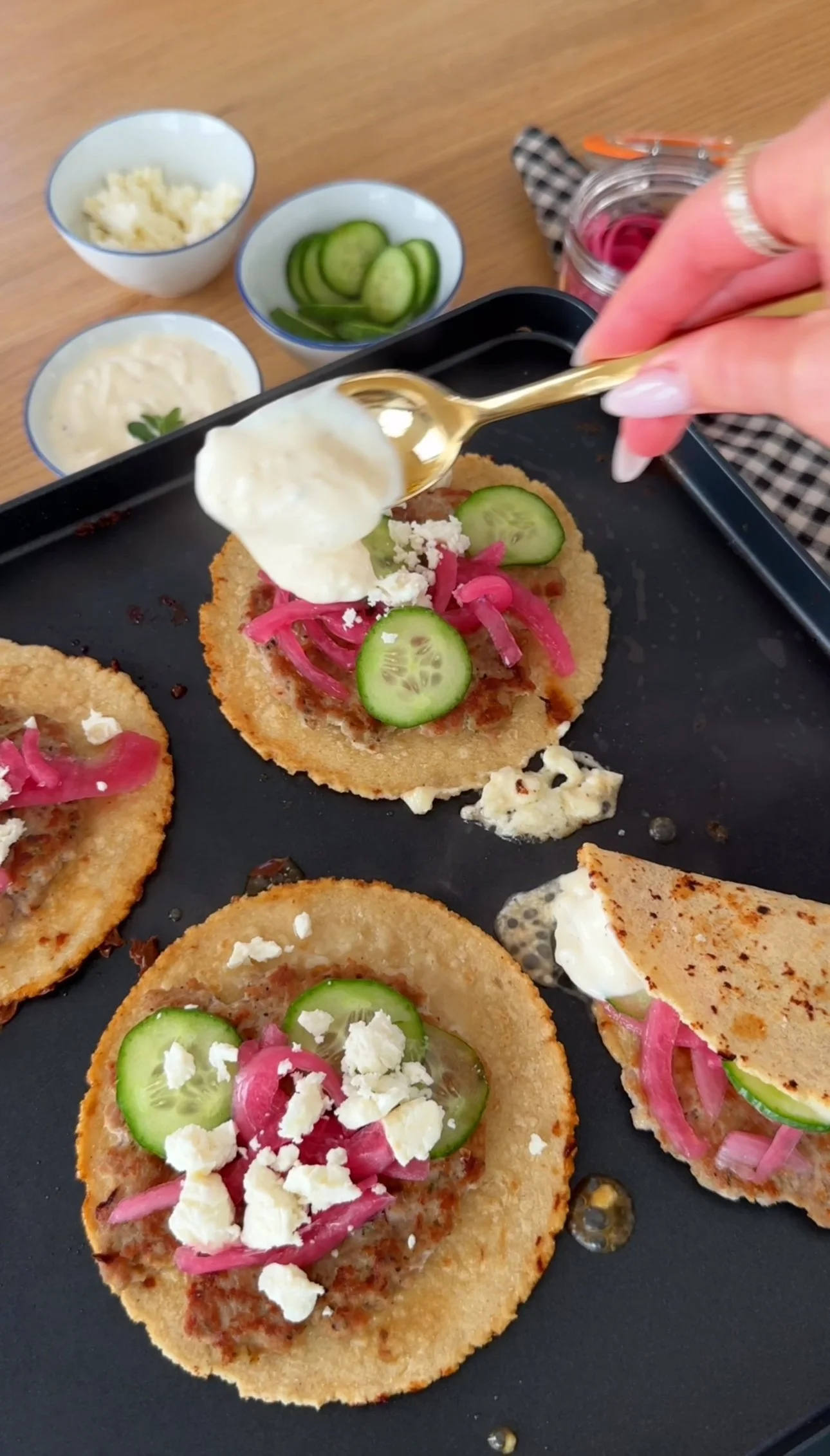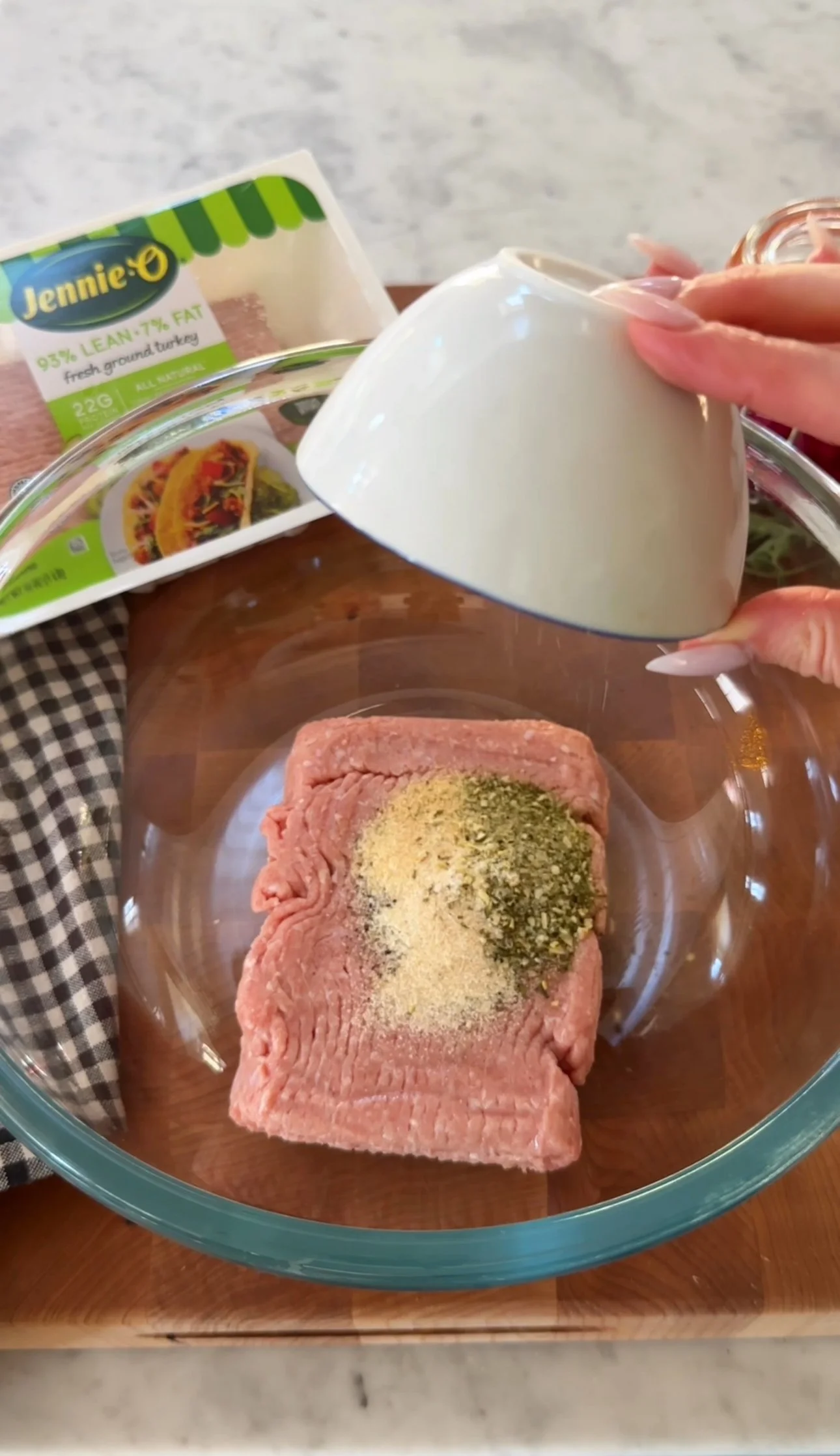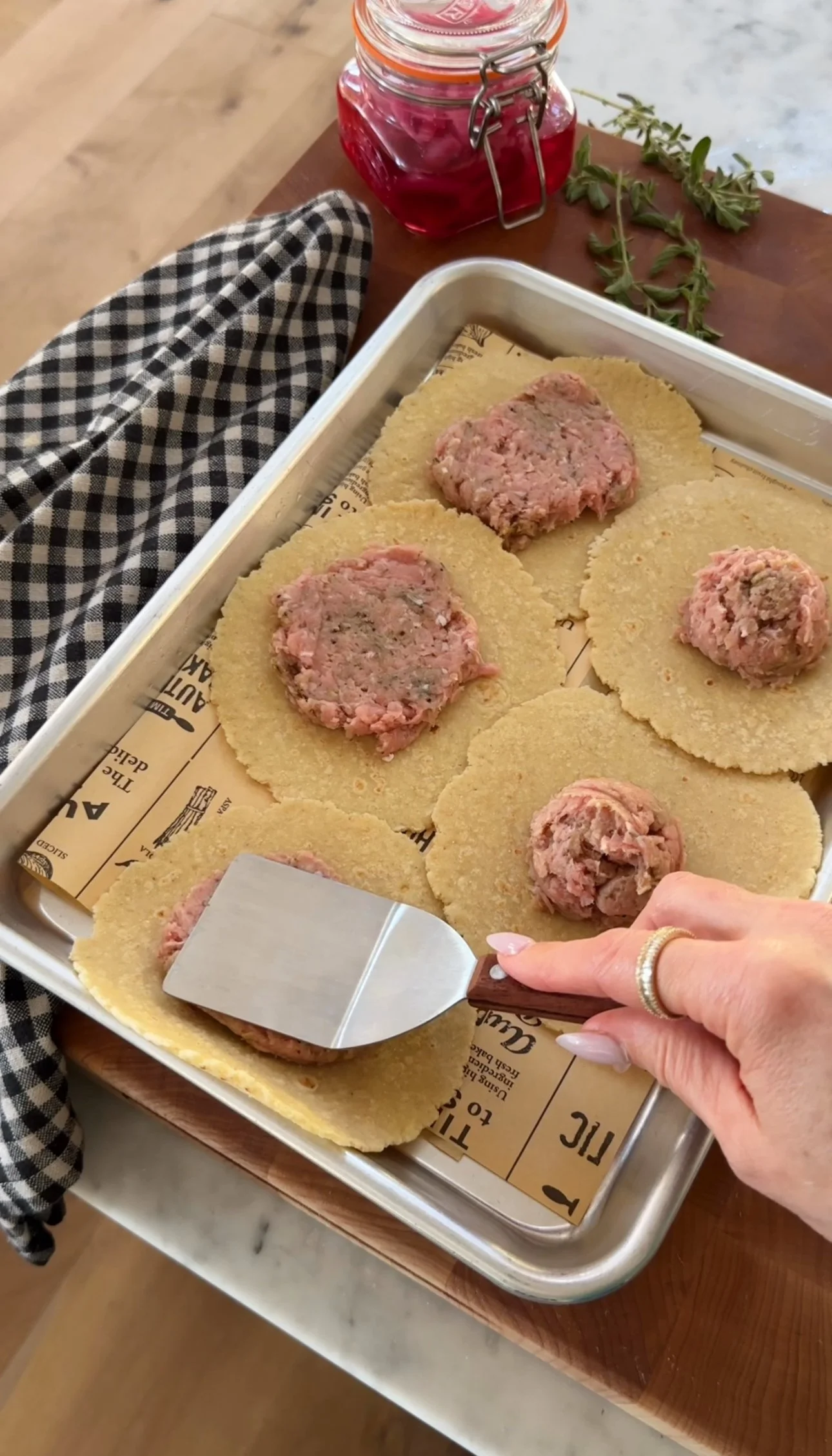 In a bowl, mix the Jennie-O ground turkey with garlic powder, oregano, smoked paprika, salt, and pepper. Make 8 small turkey balls and smash each one on the back of a small tortilla. Smash the mixture to the edges of the tortilla because the turkey will shrink a bit.