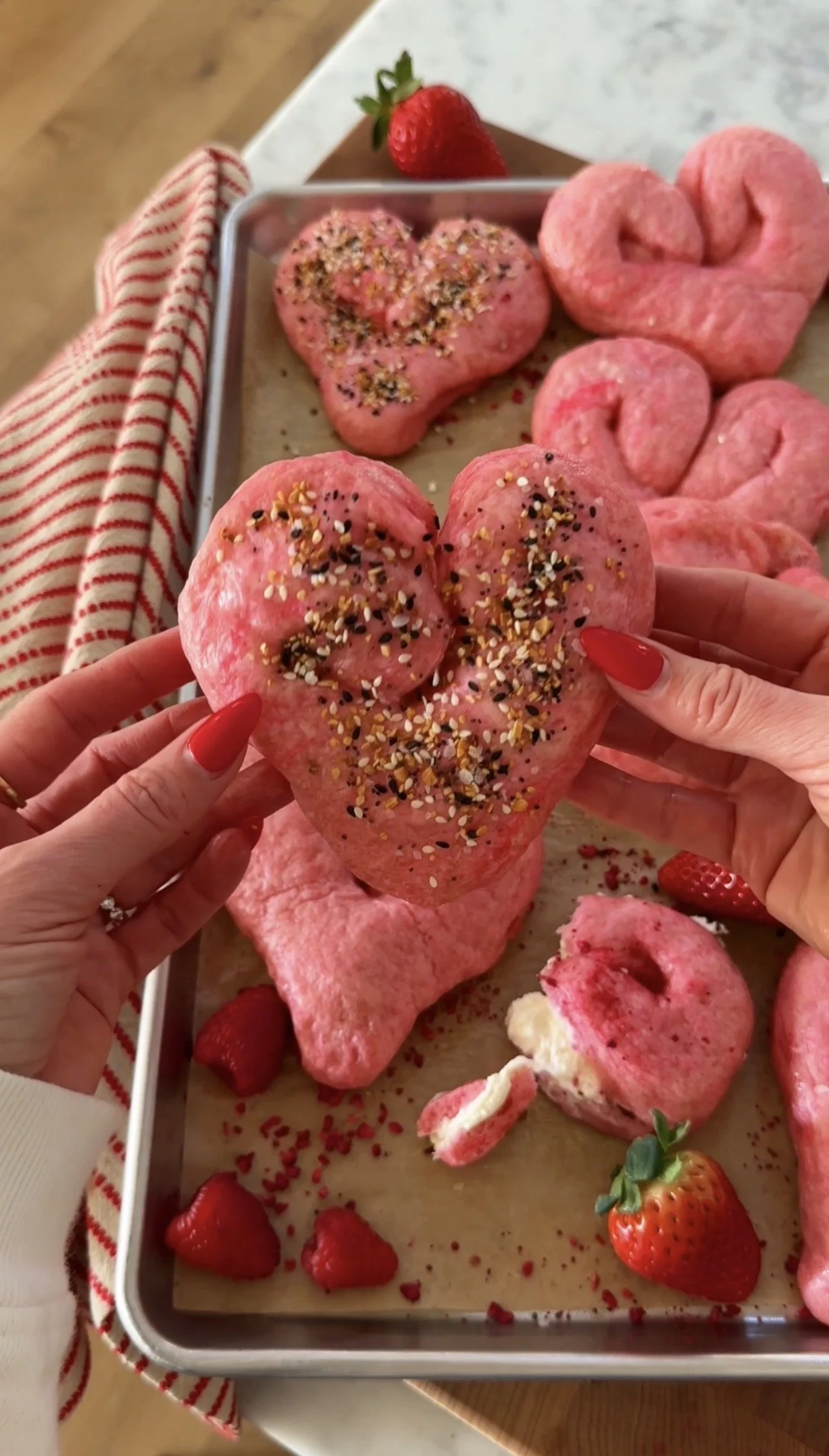 Place heart bagels on a lightly oiled cookie sheet, cover with a damp kitchen towel and allow to rest for 10 minutes. Meanwhile, preheat your oven to 425ºF / 220ºC.