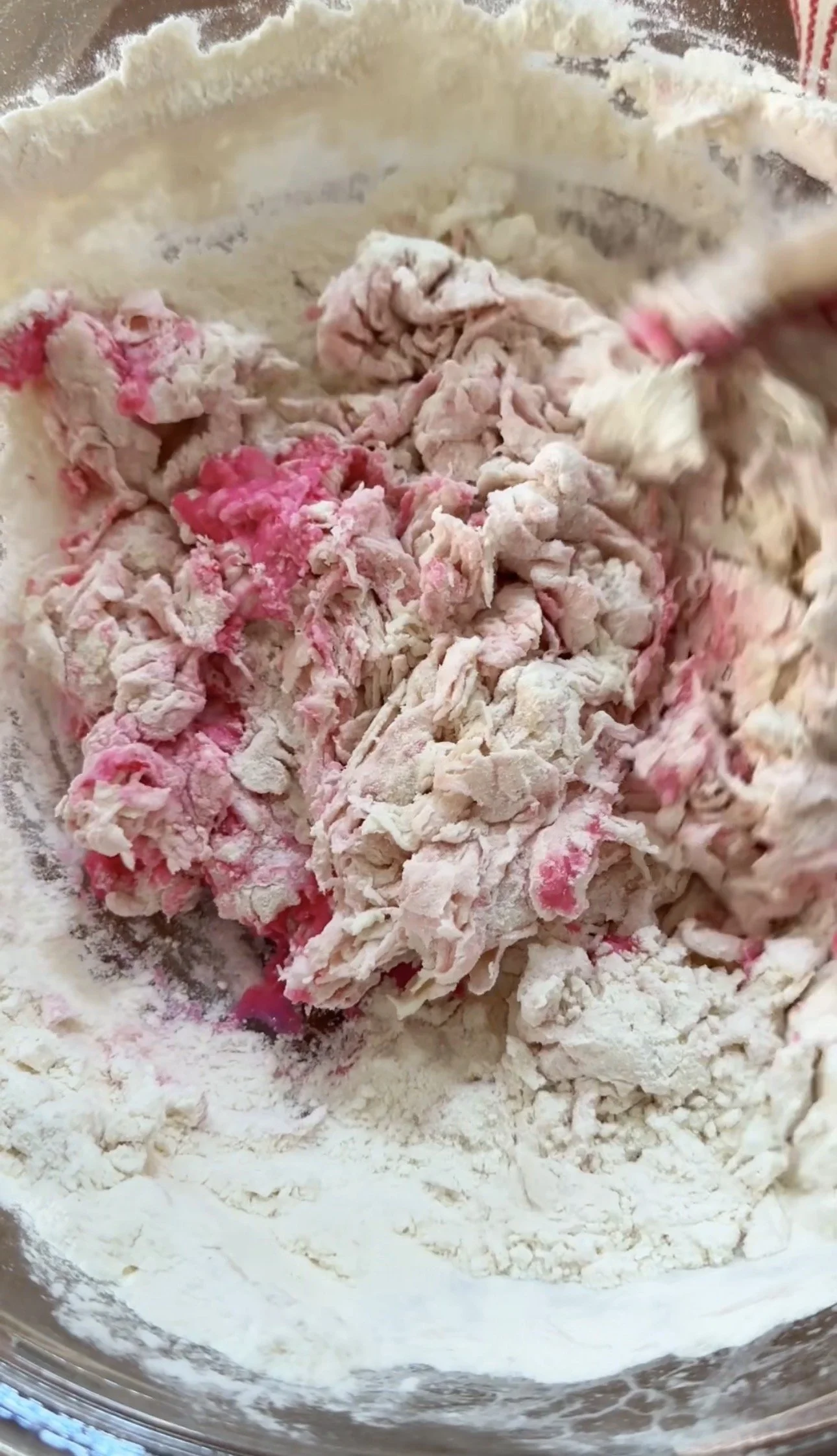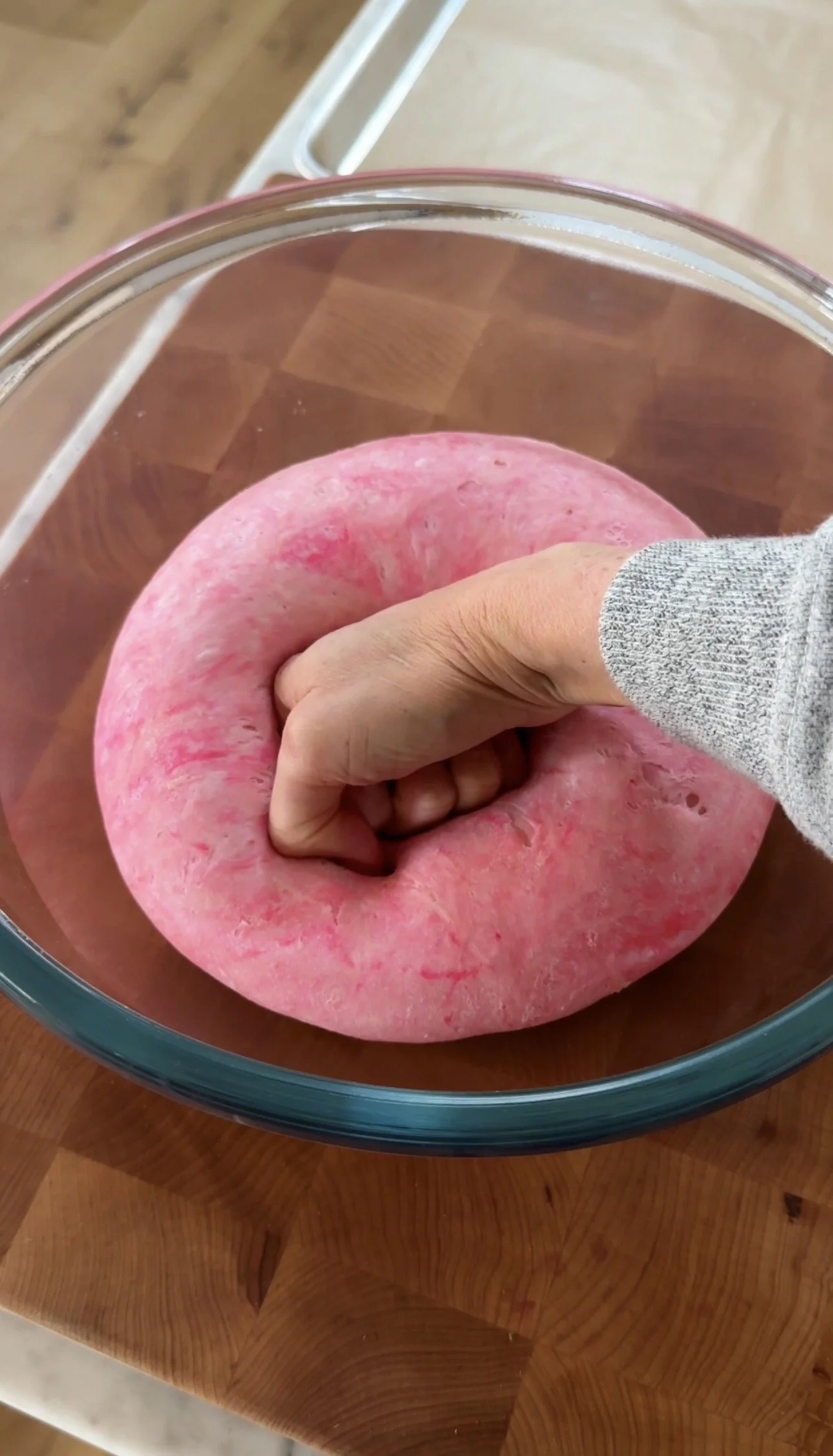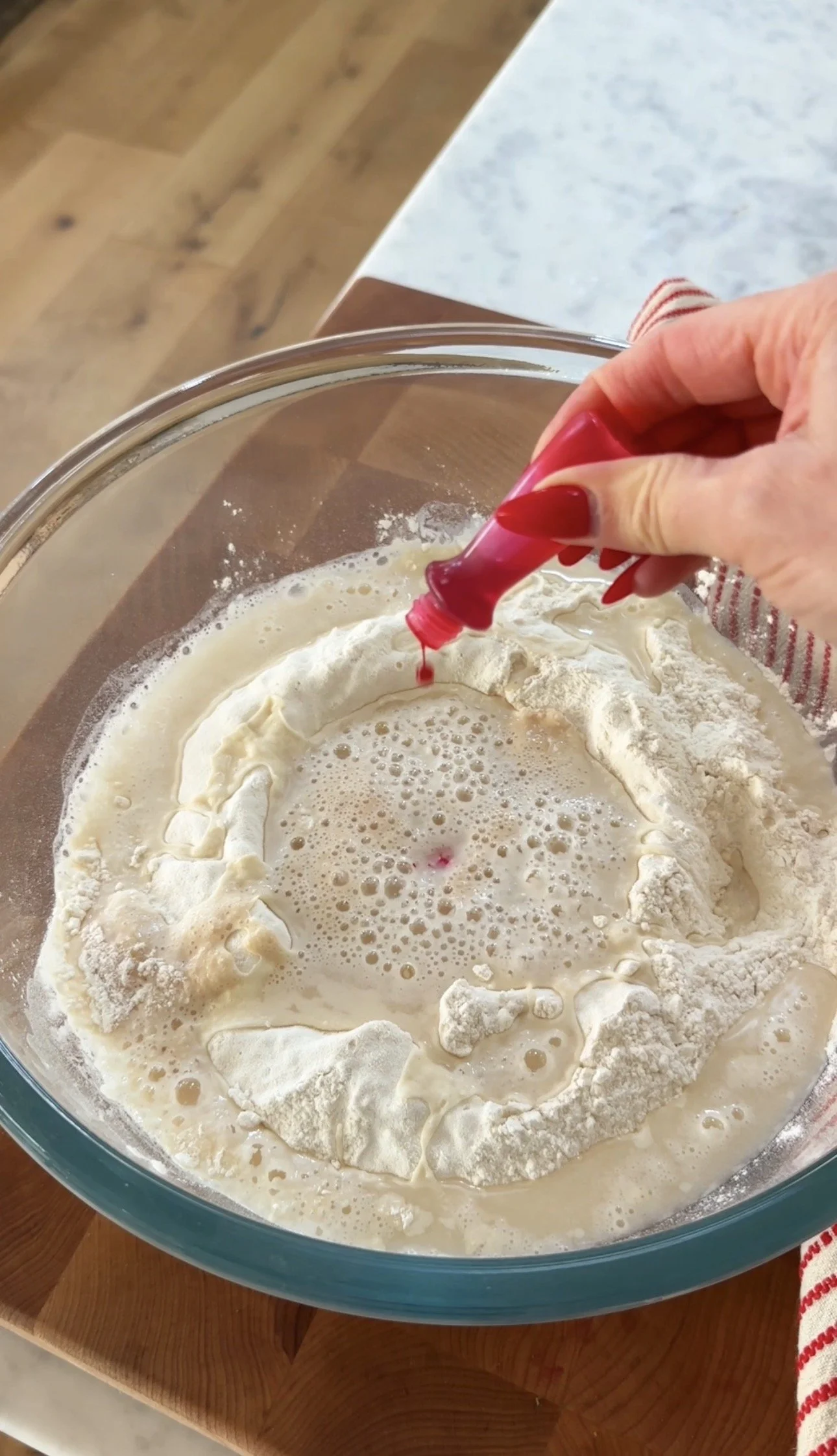 Pour 1/3 cup (80ml) of warm water plus food coloring into the well. Mix and stir in the rest of the water. Depending on where you live, you may need to add an additional ¼ cup/60ml of water. You want a moist, firm dough.