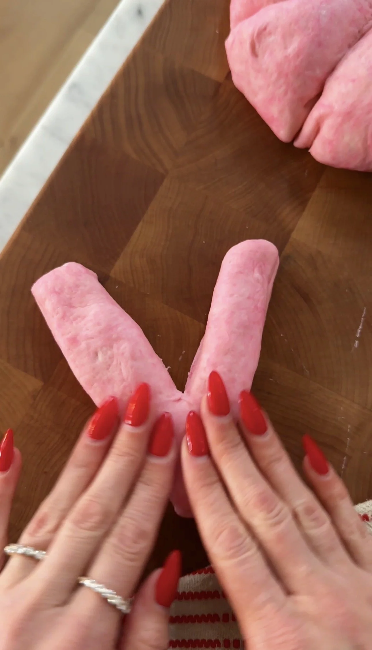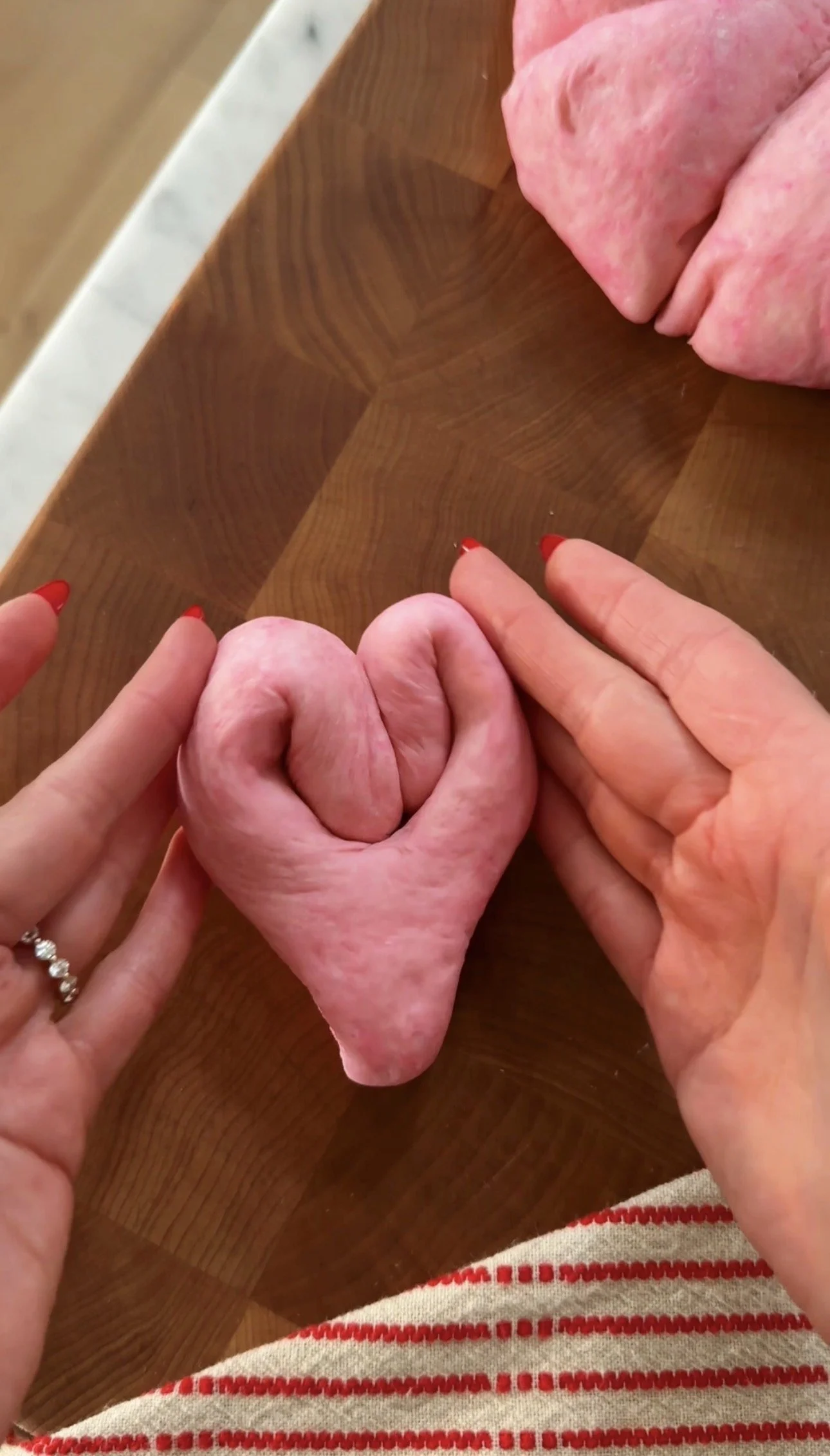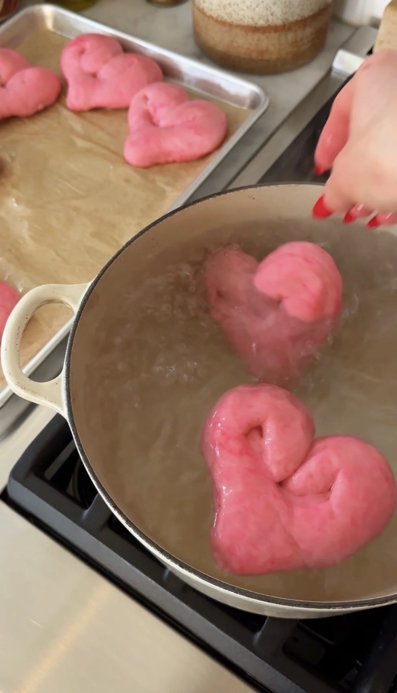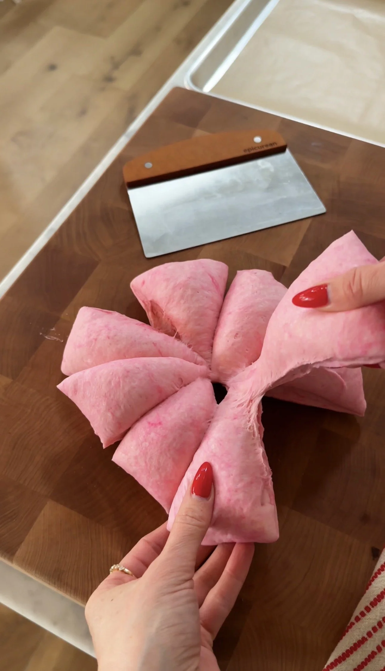 Carefully divide the dough into 8 pieces. Shape each piece into an oval. using a dough cutter or knife make a slit 3/4 of the way down the oval so you have what appears to be a “V”. Elongate the “V” and carefully turn the side pieces into the middle to create your heart. Gently press down. Repeat with 7 other dough rounds.