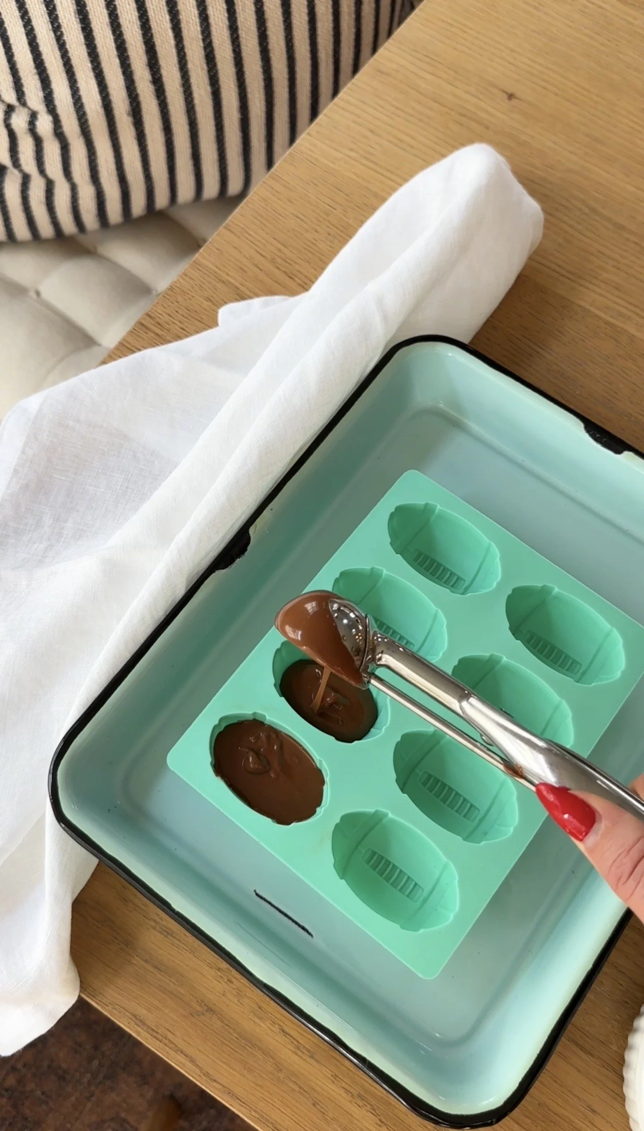 If any ice cream peeks through, simply spoon a little melted chocolate into a clean cavity and re-dip the frozen football for a second coat.