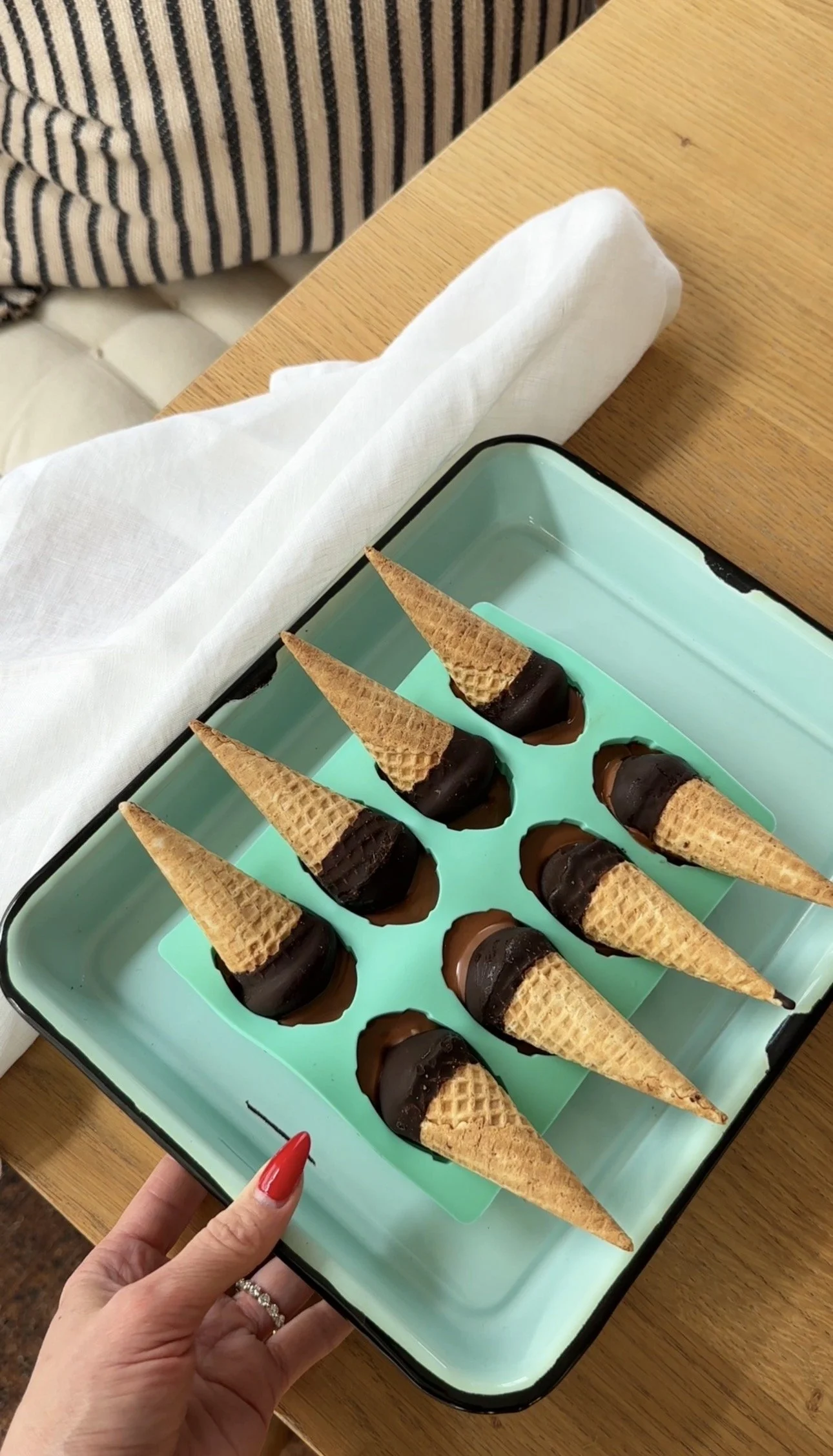Gently press a frozen mini ice cream cone into each cavity gently. Do not push all the way down because the chocolate cone will show through. Place the entire tray back into the freezer immediately.
