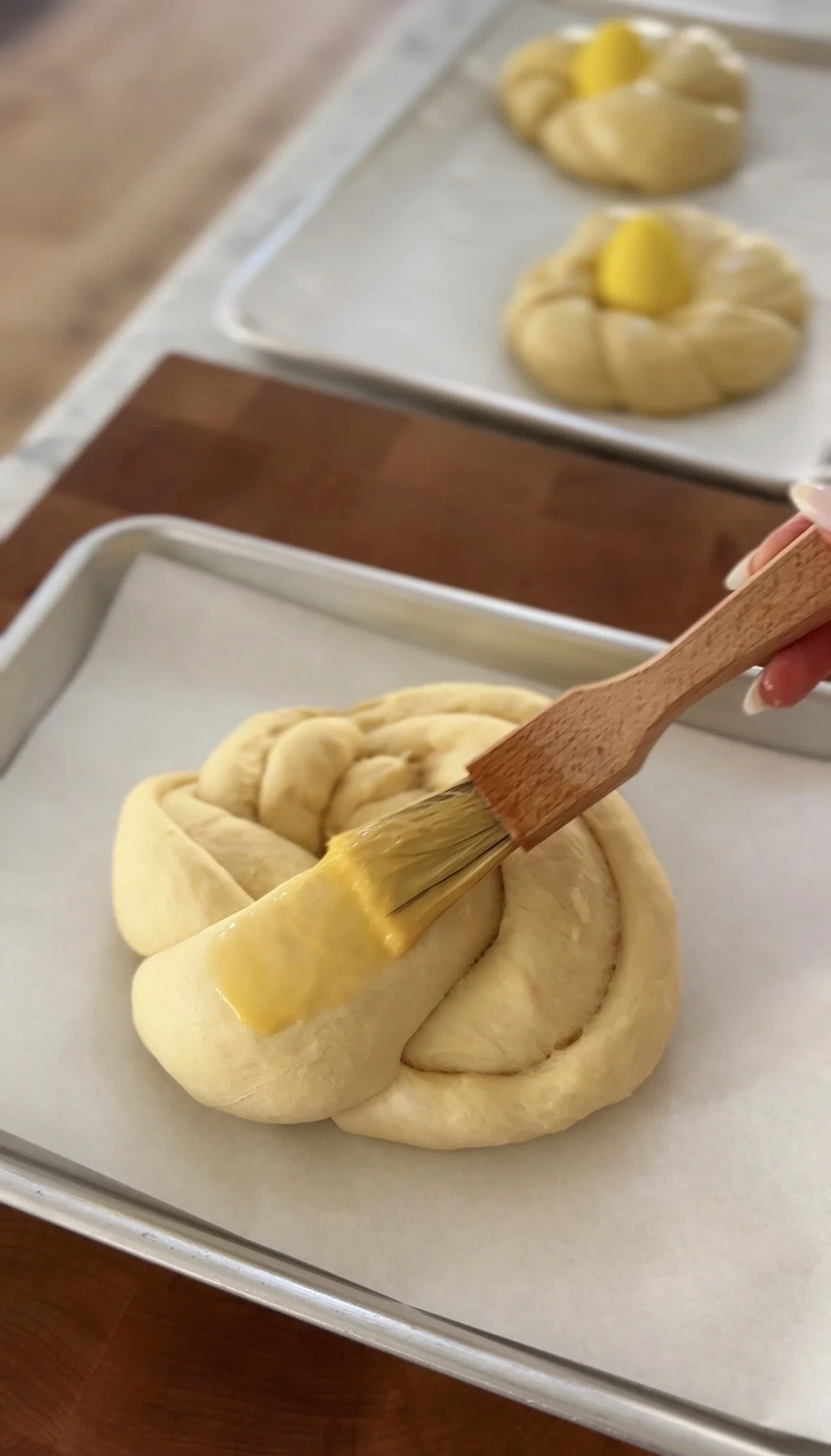 Whisk together 1 egg and 1 teaspoon of water and brush each braided bread with the egg wash. If desired, top the bread with sprinkles. Gently place one dyed egg in the center of each braided ring. Do not press into the dough - it will sink into the bread as it bakes.