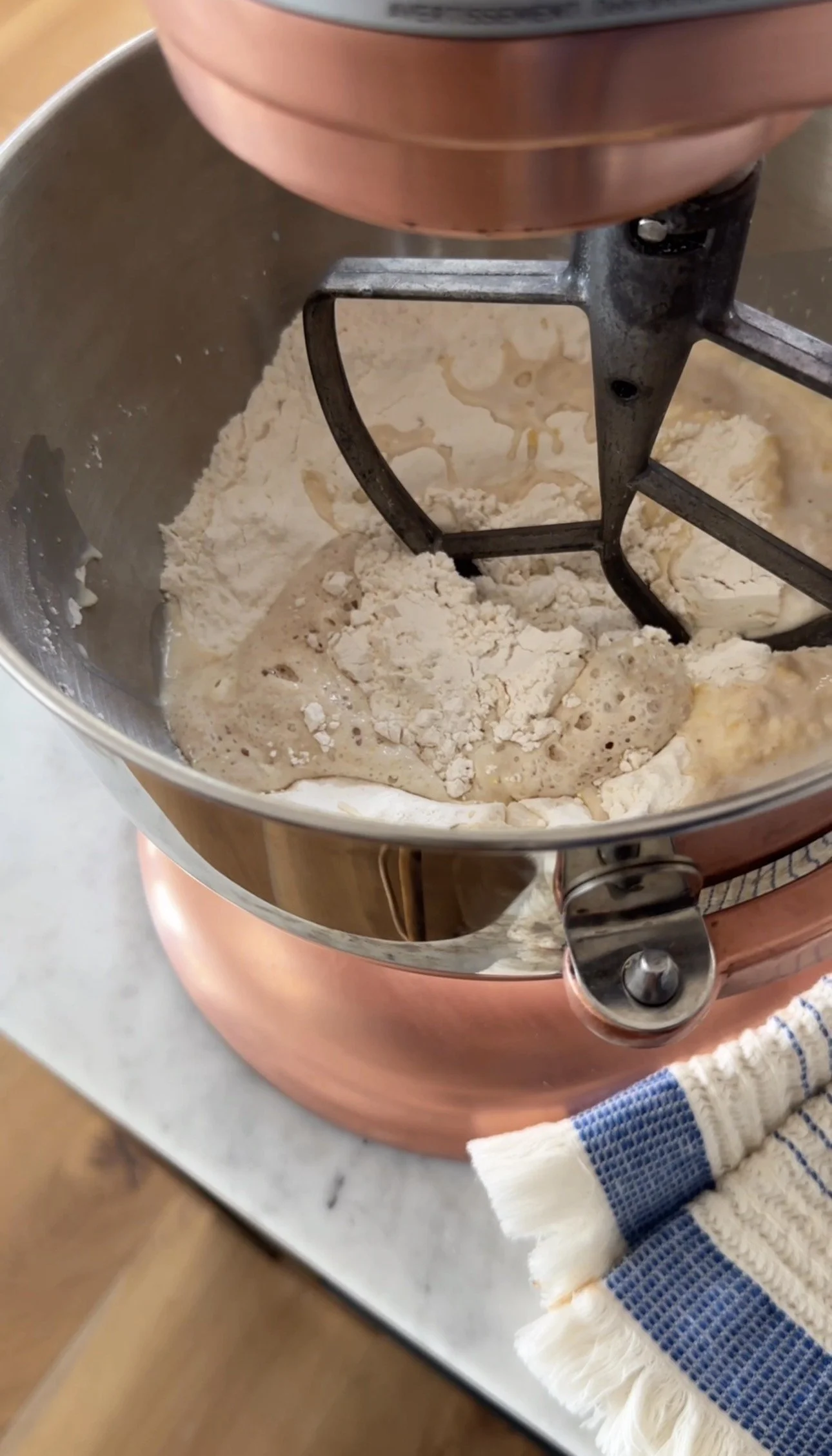 Slowly add the remaining 2 1/2 cups of flour to the mixer on medium-low speed and scrape the sides as needed. Knead until the dough is stiff and slightly sticky, about 10 minutes.