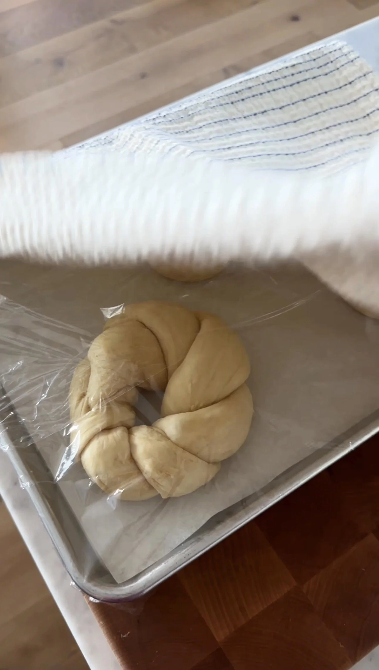Loosely cover the shaped dough with plastic wrap and a dish towel and place it in a warm area. Let it rise until doubled in size, about 1 hour to 90 minutes (if your kitchen is colder.