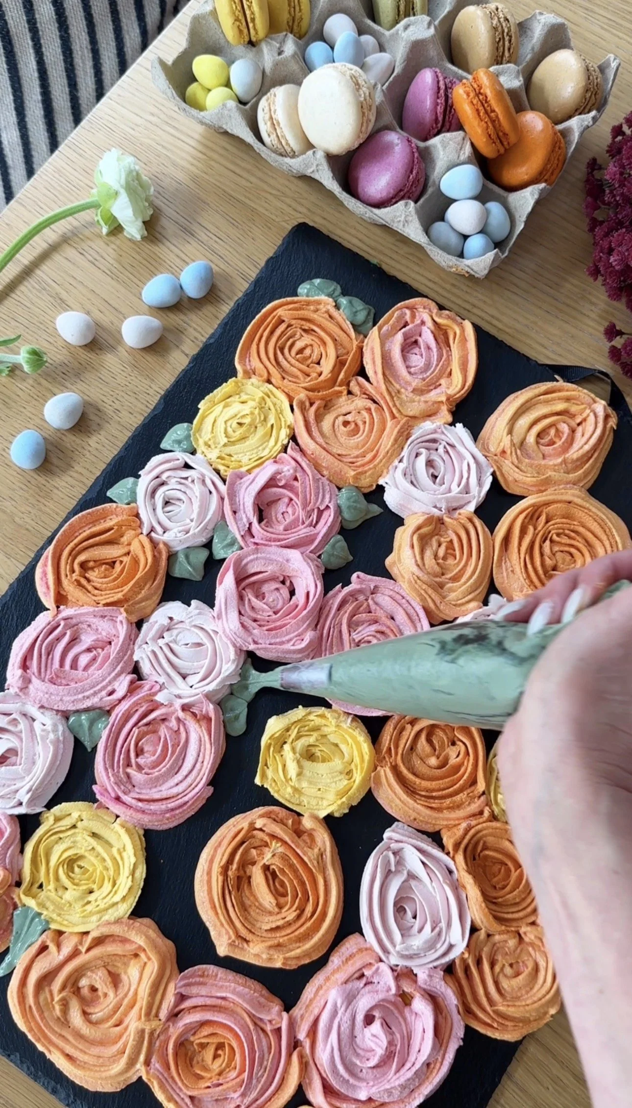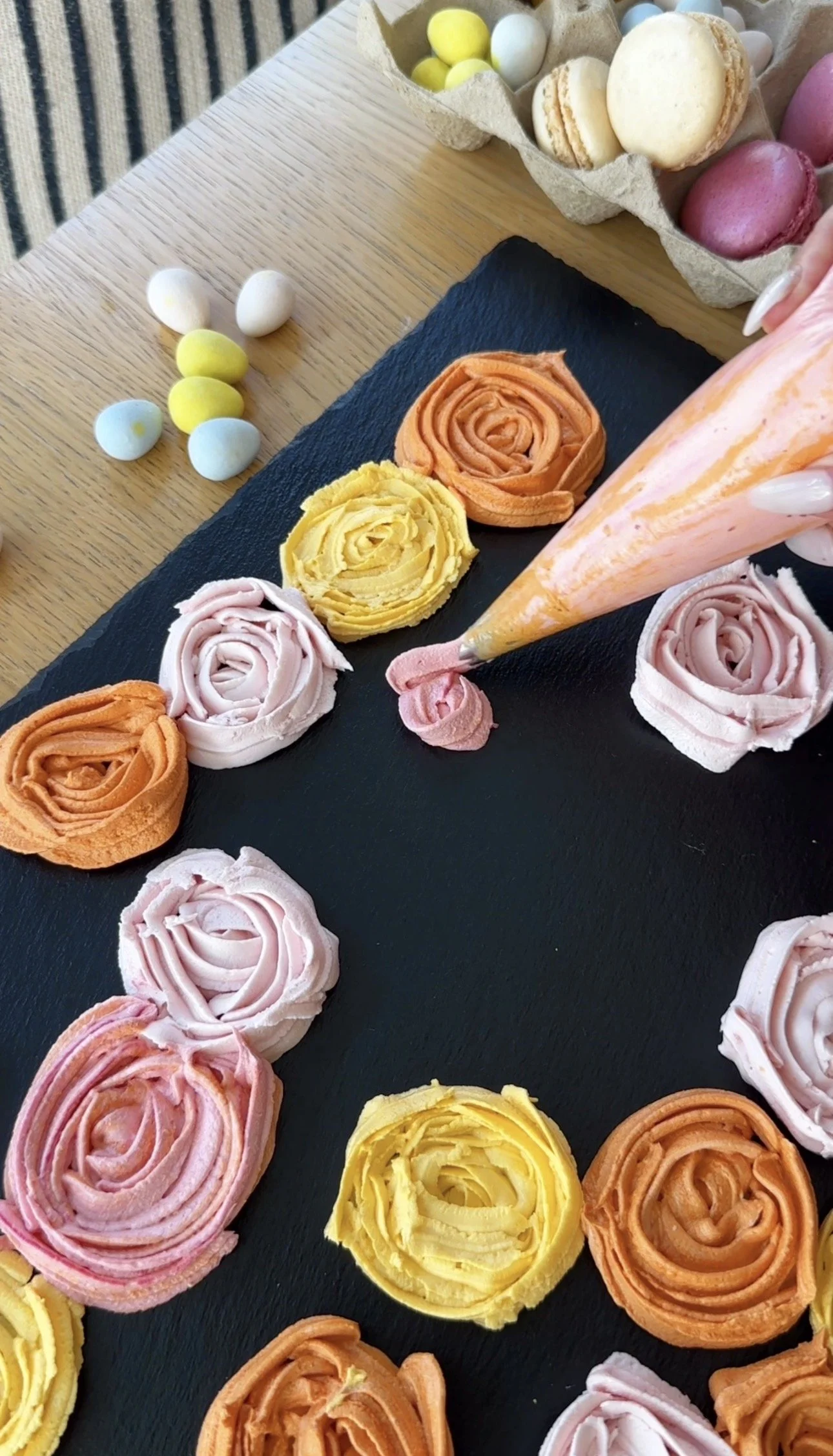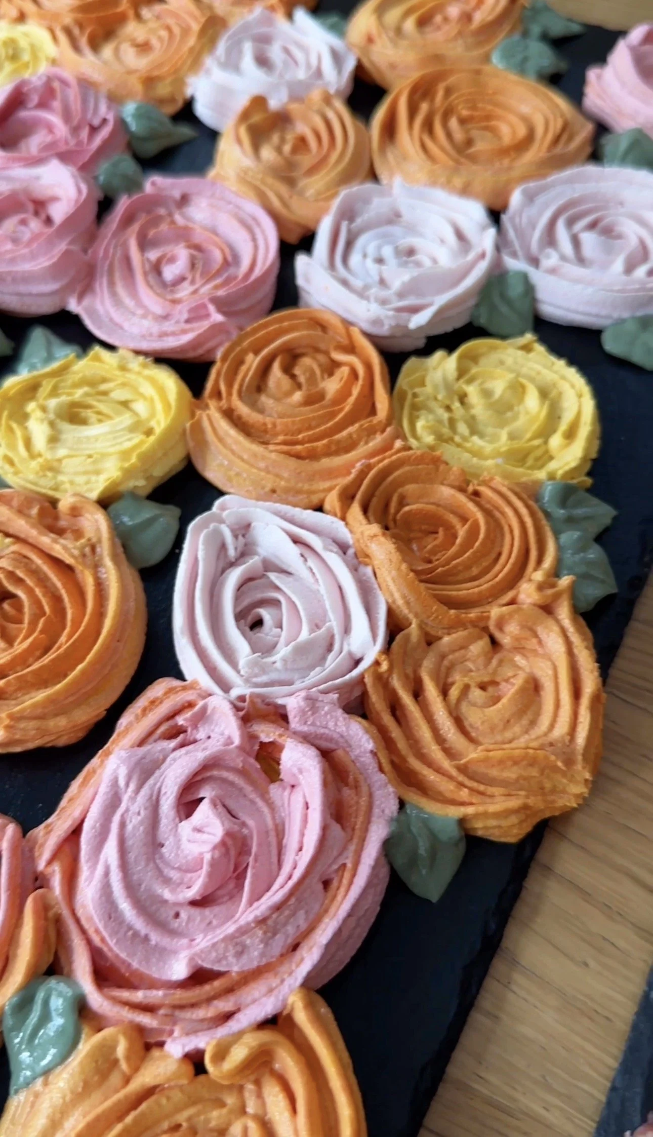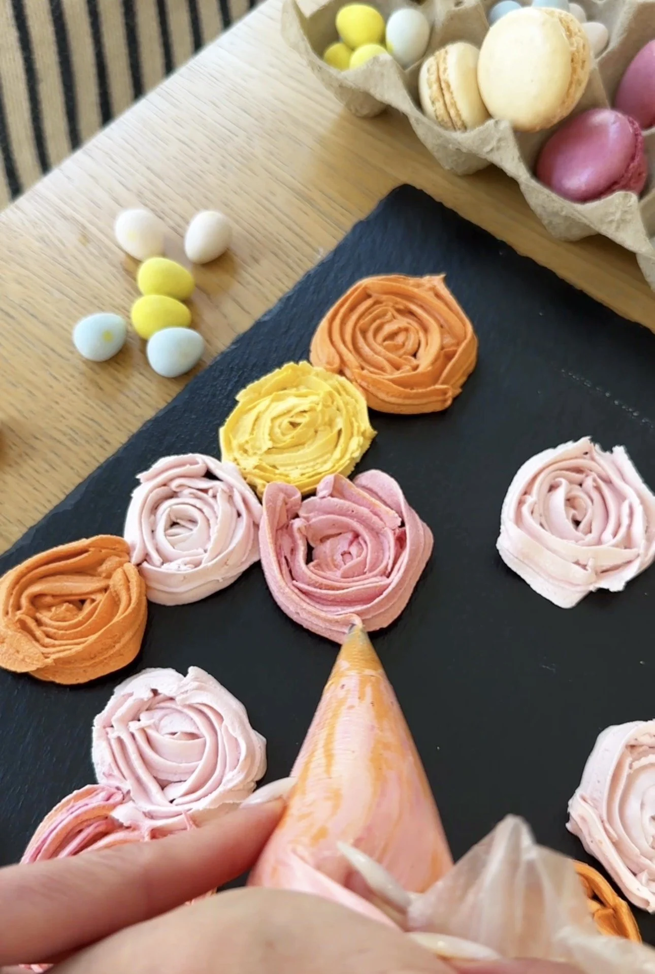 Separate into 3-5 bowls and add 1/8 teaspoon natural colored powder to each bowl. Mix well and add the first color to a piping bag fitted with a petal tip. Pipe your roses all over your slate board. It’s easiest to pipe half circles, layer by layer, until you have a rose. Add a second color to the same bag and continue piping more flowers. The roses will gradually change colors as you fill the same bag with different pinks.