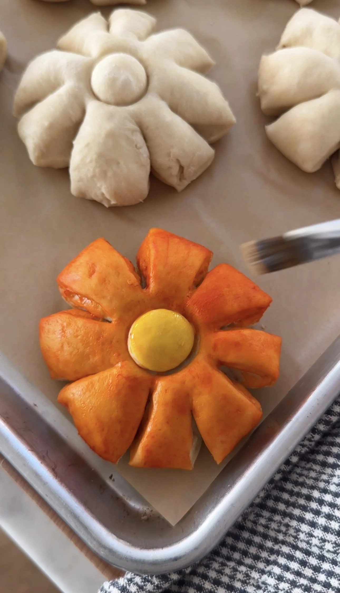 In a small bowl mix 1–2 teaspoons warm water with 1/4-1/8 teaspoon natural food coloring powder. Stir until smooth. Lightly brush the flower-shaped dough with the natural coloring to create pastel petals. Let dry for 15 minutes.