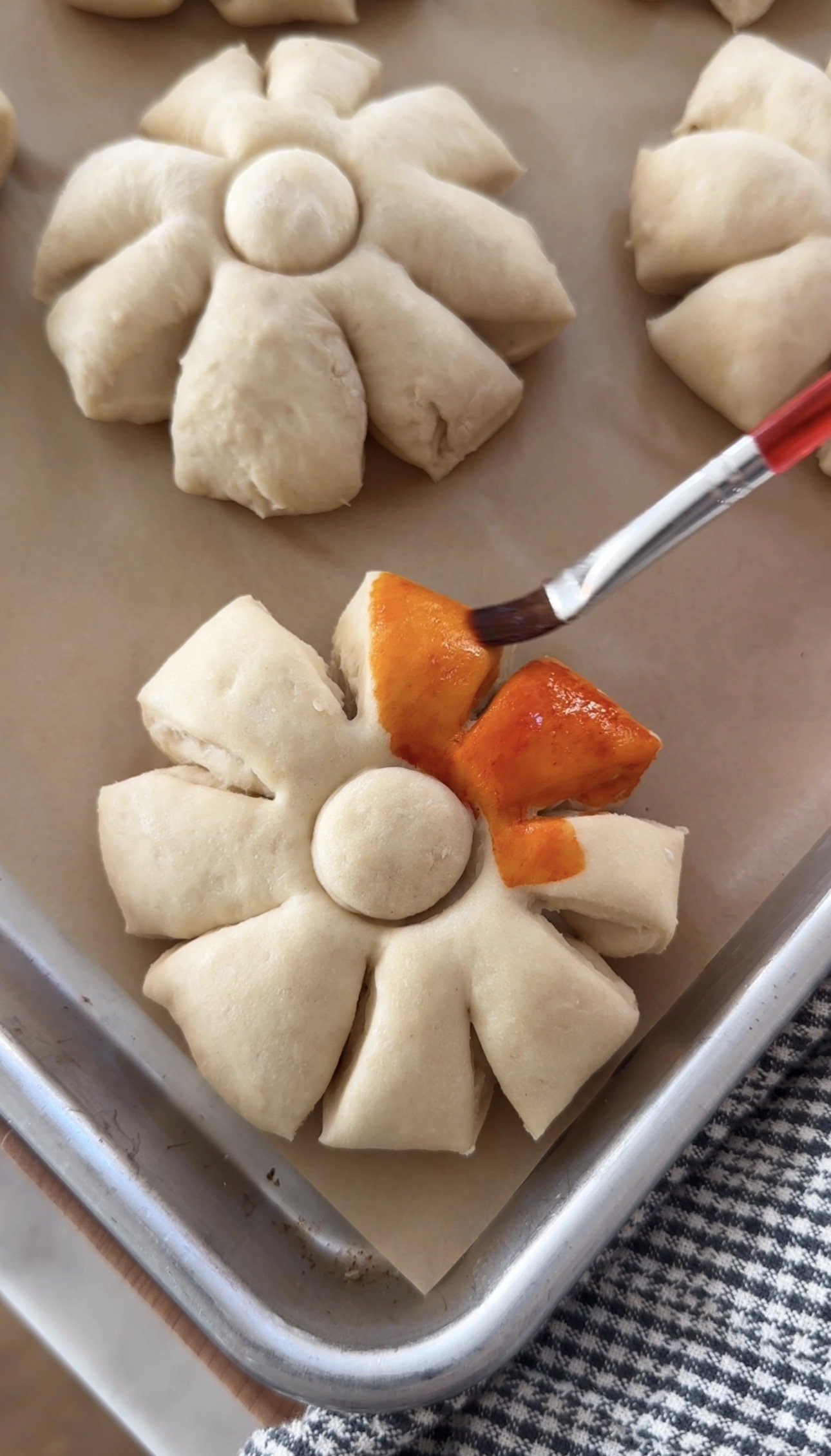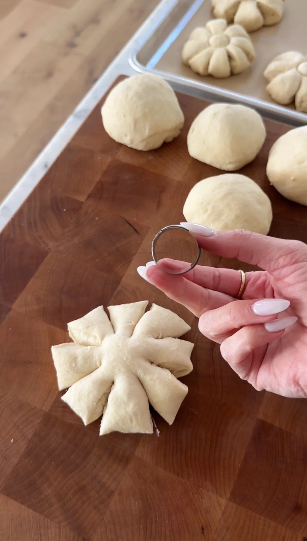Using a sharp knife, carefully make 8 small slits around the sides of each dough ball, spacing them evenly to create a flower shape.