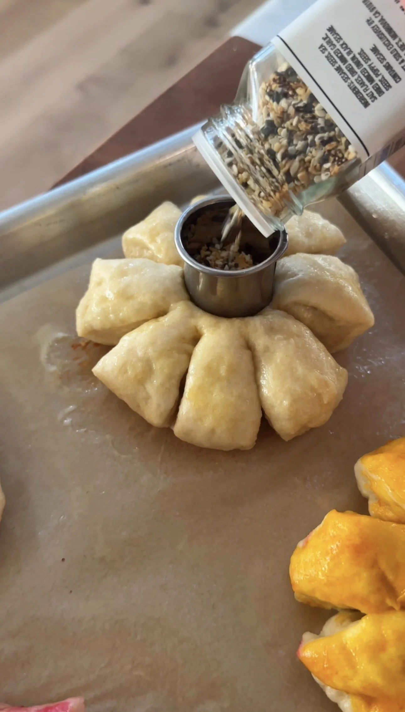 Brush each bagel with the egg wash. Sprinkle everything but the bagel seasoning in center of the bagel indentation.
