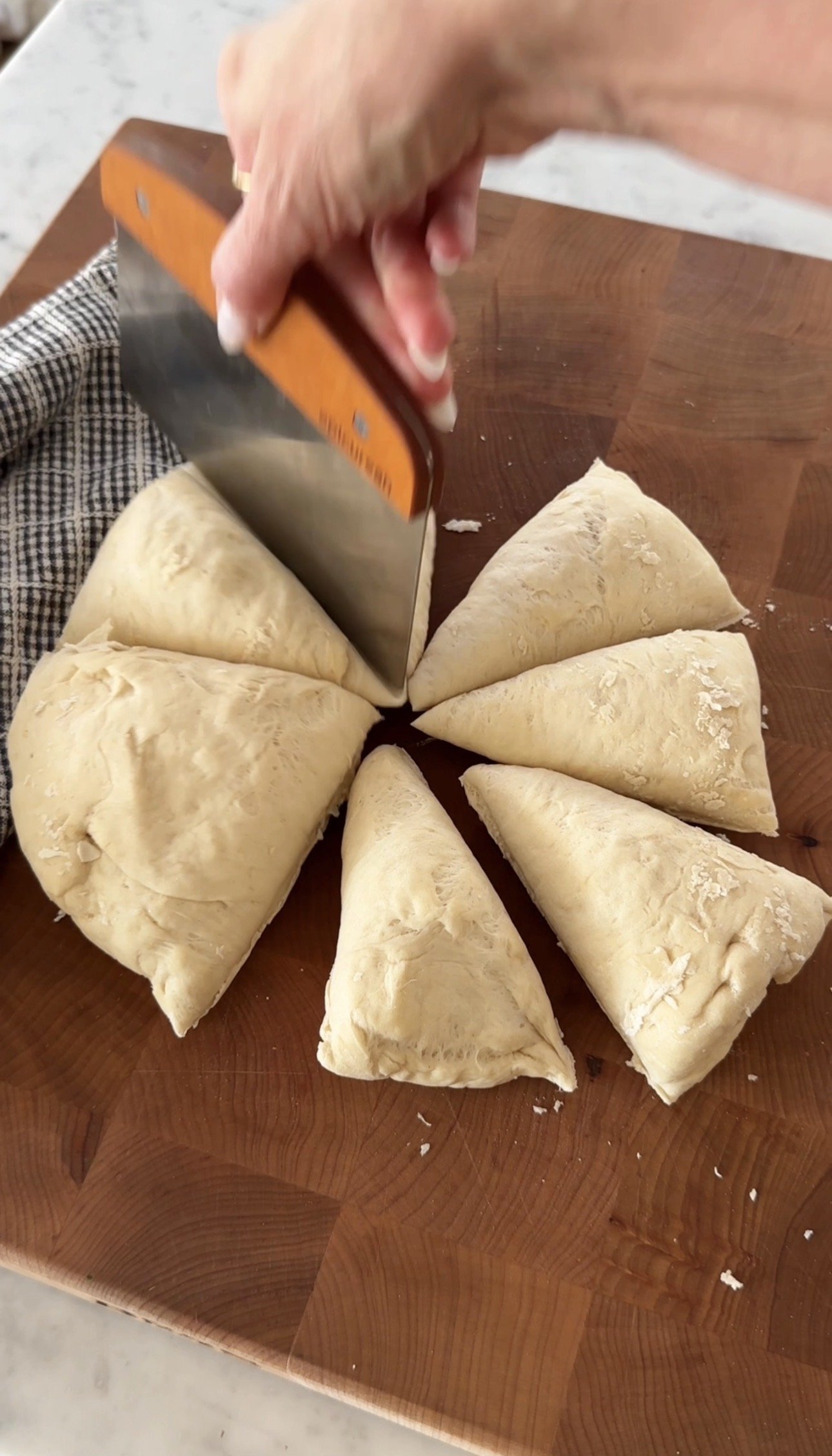 Once risen, turn the dough onto a lightly floured surface and divide into 8 equal pieces. Roll each piece into a smooth round ball.